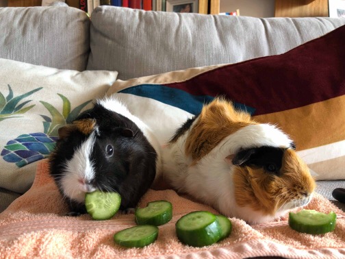 They love their veggies, particularly carrots! They sometimes go into temporary drama queen mode when being picked up. Coco is generally a bit more fidgety but Ginger is the attention seeker - loves cuddles and stretches out when she’s relaxed. Both like their chin scratches. Ginger likes to rumblestrut and show Coco who’s boss.