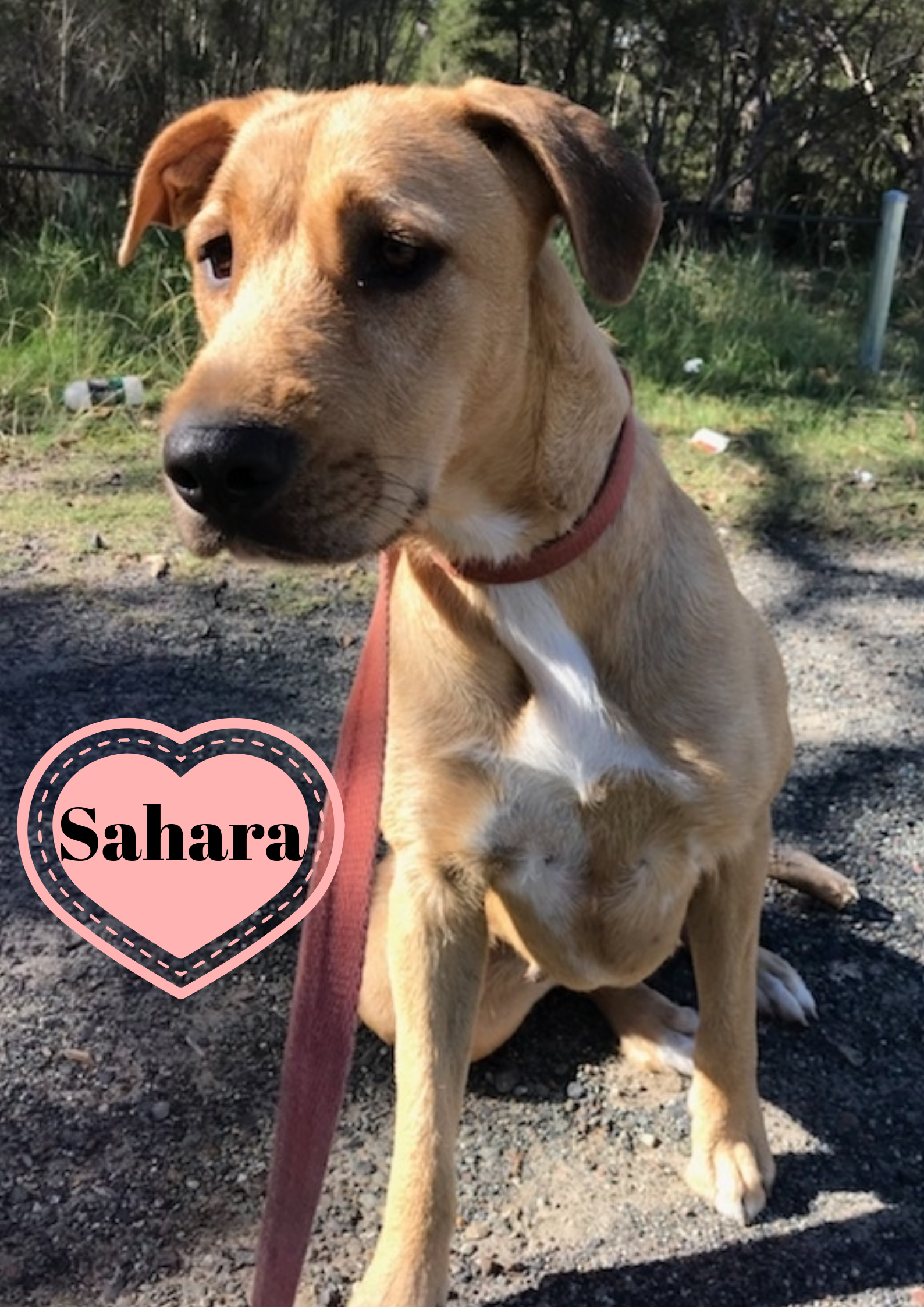 Sahara is a sweet heart and she loves to be fussed over. She has a lovely gentle nature and she would be a wonderful addition for any family. Sahara is a pleasure to walk on the lead, she doesn’t pull and she is not fazed about what is going on around her. Sahara uses her manners when she meets her pound buddies and she initiates play with them in a calm way. Sahara is yet to be tested with cats.