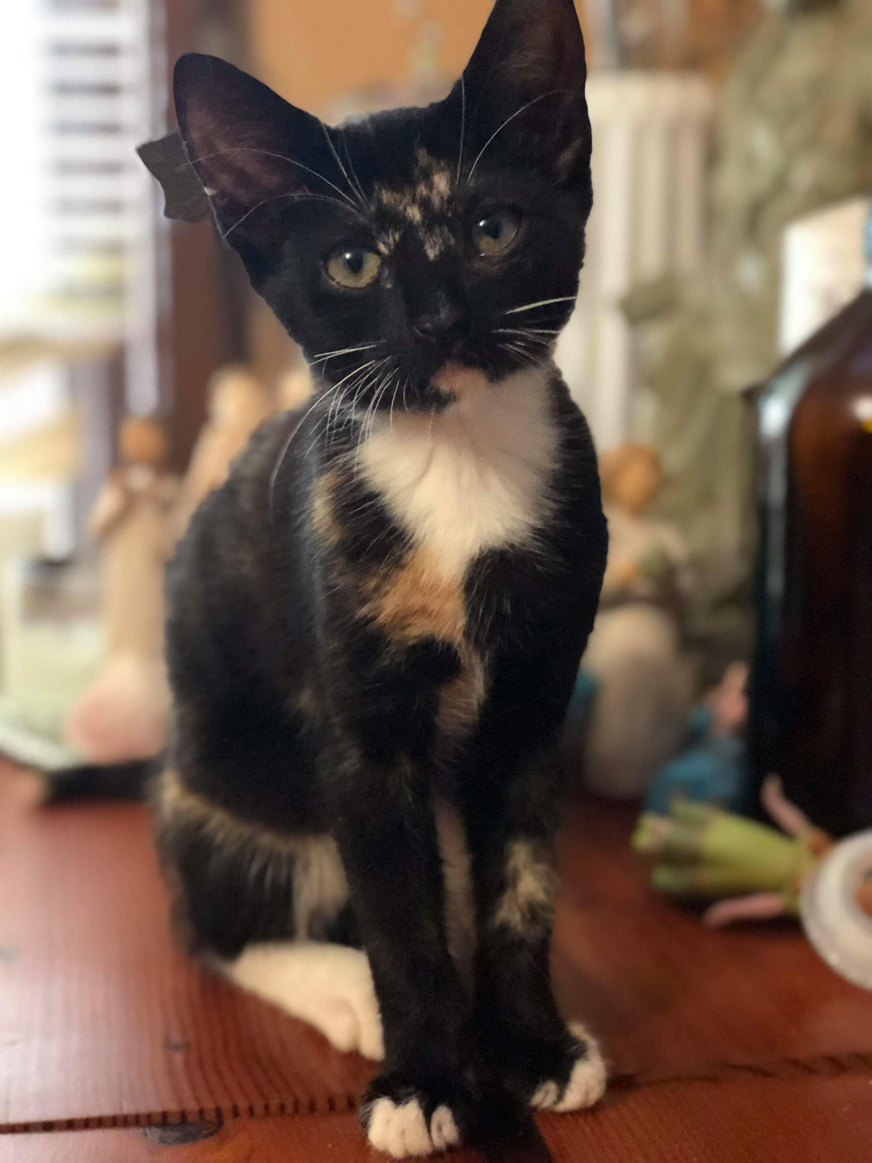 Evie isn’t fond of dogs and would be best suited in a home without them. But another kitten or cat would be okay as she is being fostered with her brother Dash and they get on really well.