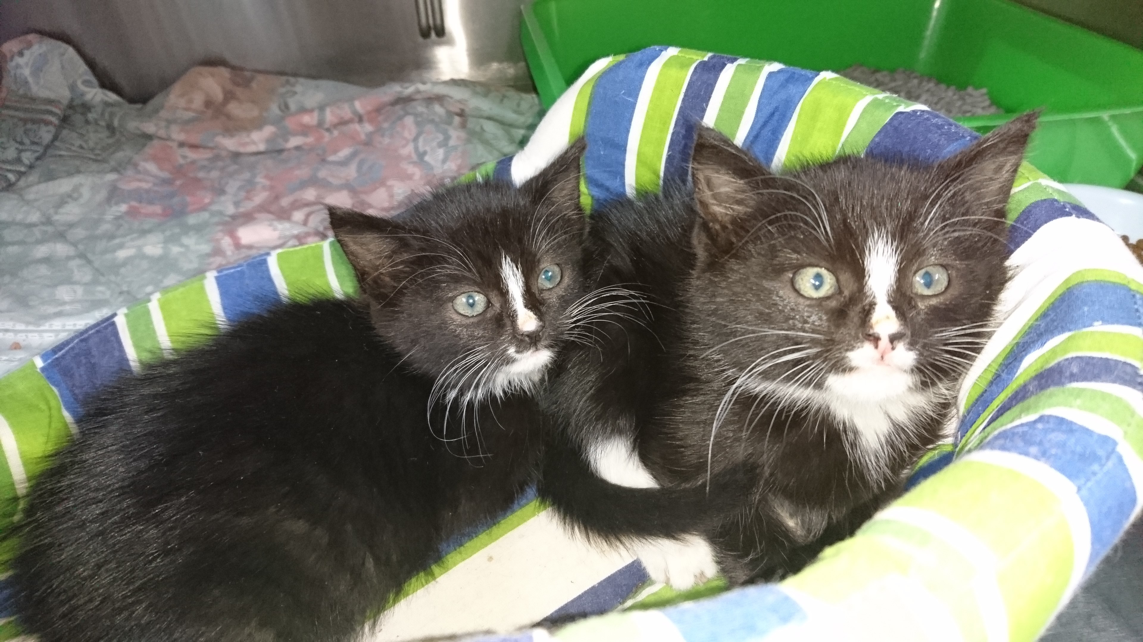 Moe (male) & Suzy (female) have only been in care for a couple of days & were very timid when they arrived. We suspect they had not been handled much before they came into care with us as they had no idea how to react to being cuddled, patted or show affection. They are improving every day & are now being shown lots of love. The are normal playful little kittens who just bounce off each other. They are available for adoption either separately or together. Their adoption fee will be discounted if they go to the same home.