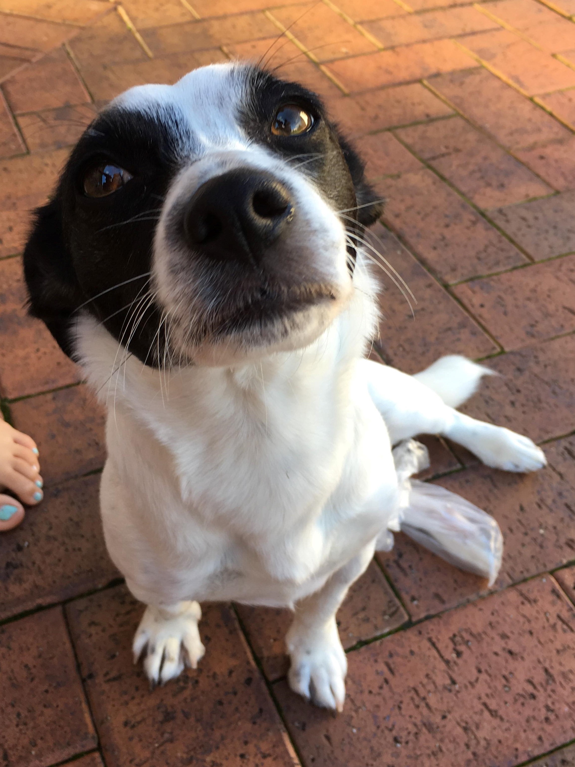 Chloe can be a bit wary when meeting new people, but if you let her get to know you in her own time and if there is a treat involved it doesn't take her long to come around.