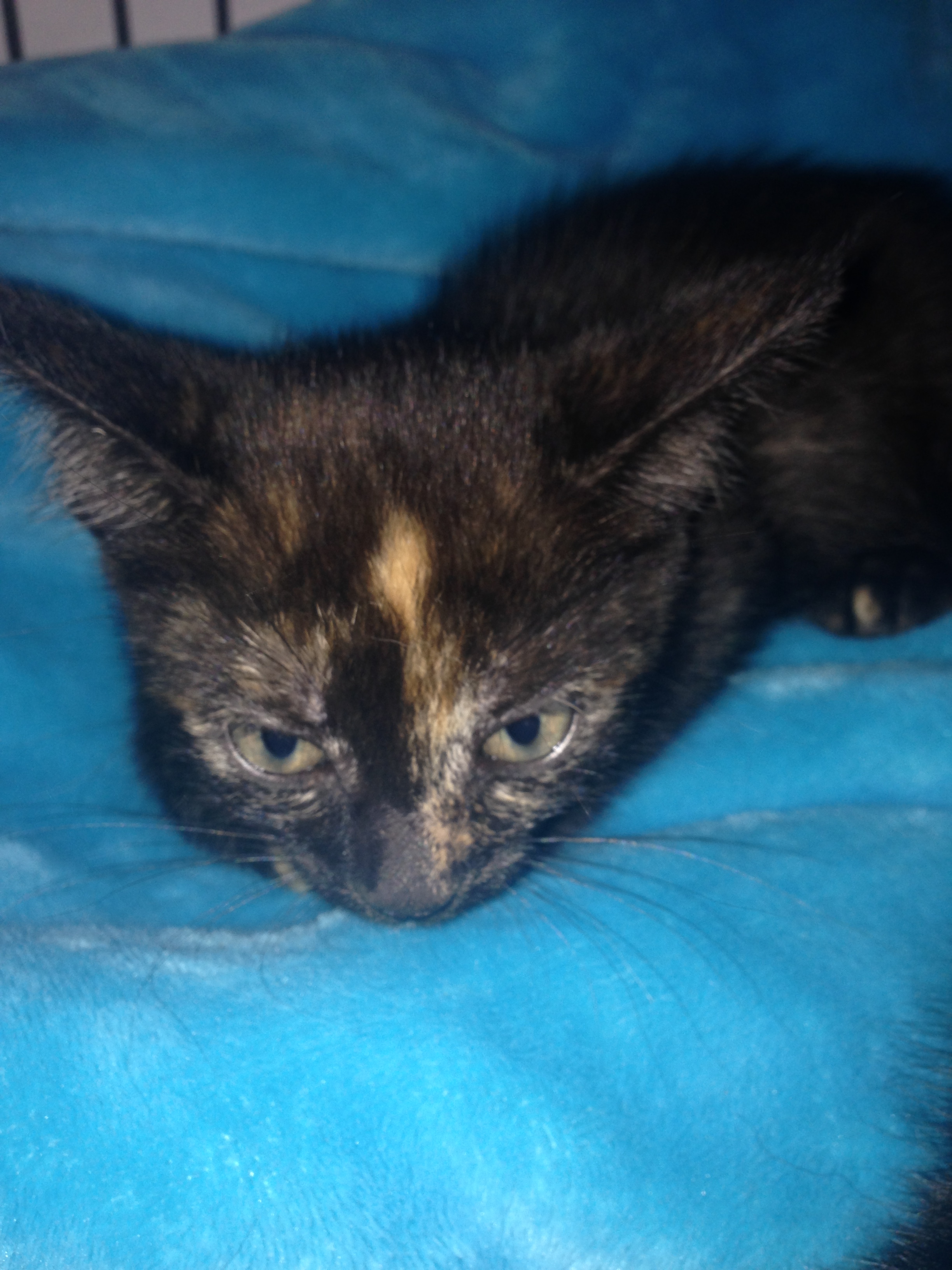 Super friendly young female black/ tortishell kitten. Loves people, other cats, kids and friendly dogs. Also available is male sibling Poe
