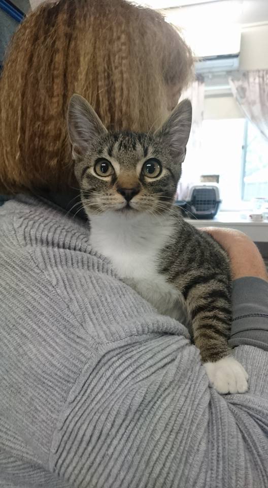 Bentley is a beautiful tabby and white kitten approximately 4 months old. He was found hiding under a car staying close to a female cat that had been killed presumably by a car. He was rescued by kind people and taken to rescue under duty of care from the pound. He is thriving in his foster home and is a healthy and confident little man, very friendly and so loving. This little boy starts to purr as soon as you pick him up. His nose has not been out of the food bowl. He has a sweet little white bib and white socks. Bentley is very loving and affectionate and would love to be in his forever home.