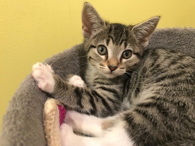 She is a beautiful dark tabby with long slender legs like a dancer. She is very shy and demure and whilst she loves to play her sister Tinker seems to dominate all the action. Ican see her coming out of her shell with the right family environment where she can have a relatively quiet space to retreat to and be gently introduced to family and furr friends. With love and patience she will be a very sweet addition to your family with very few demands.
