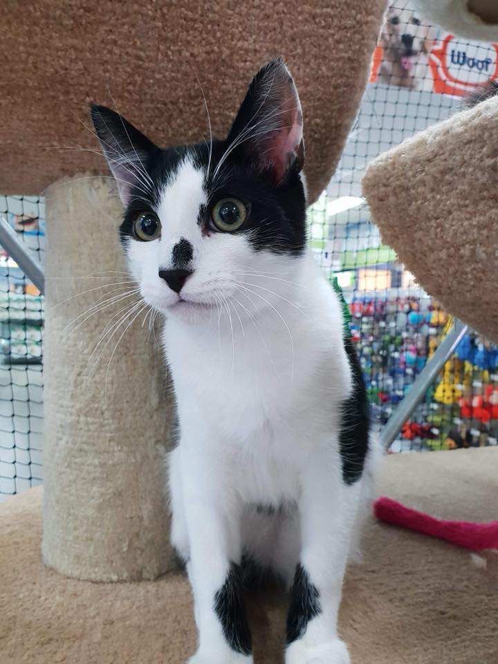 Mitch is a courageous little explorer. He loves to venture around the house and is unafraid to meet new kitties or discover new places. Like his brother, Tony, Mitch is a snuggle bunny with a purr like a motor. This photogenic little boy has a beautiful black and white coat and gorgeous hazel eyes.