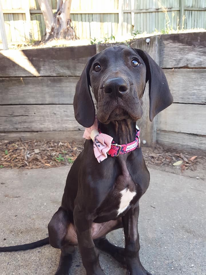 Hi my name is Sophie and I’m a super adorable 13-week-old pure female Great Dane. As you can imagine I am still learning my way around, especially my legs. I am a bit of a klutz; I fall over a lot. I am still learning not jump with excitement when I meet new people – I just love them so much. My foster mum is working on this with me, but I will need some more help to help set my new skills in concrete. I absolutely love other dogs, the bigger the better. P.S. I already think I’m a big dog. I haven’t met any small dogs yet, although a little birdy told me I will get to soon if I’m not adopted out super-fast! Little fluffies shouldn’t be an issue though, I have already grown to love playing with my foster kitty sister. I have pretty good leash skills, however these will develop under your guidance and training as I get older. I already know how to sit and drop, but I’m working on more skills. I love my food, my toys and my pats so I’m easily motivate to work, but I’m also easily distracted as us puppies are … wait … was that a mail man?