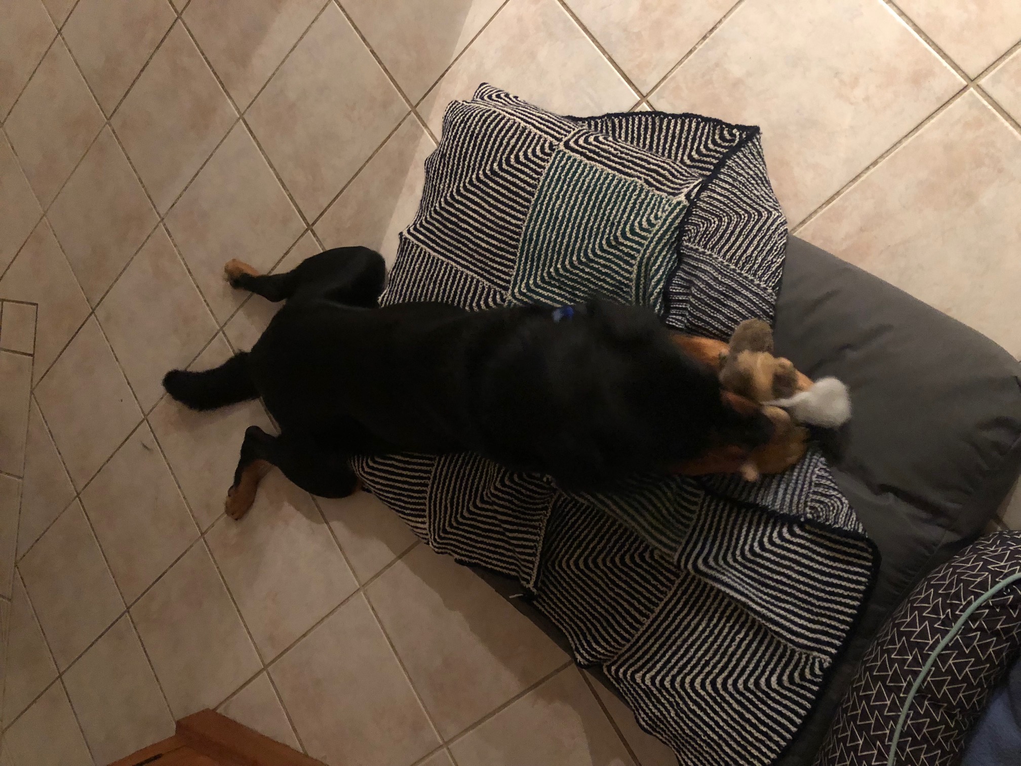 Marley can at times be a little unsure of her temporary home so she loves to get cozy under the bed. Splayed out legs is a cute relaxation trait of hers too.