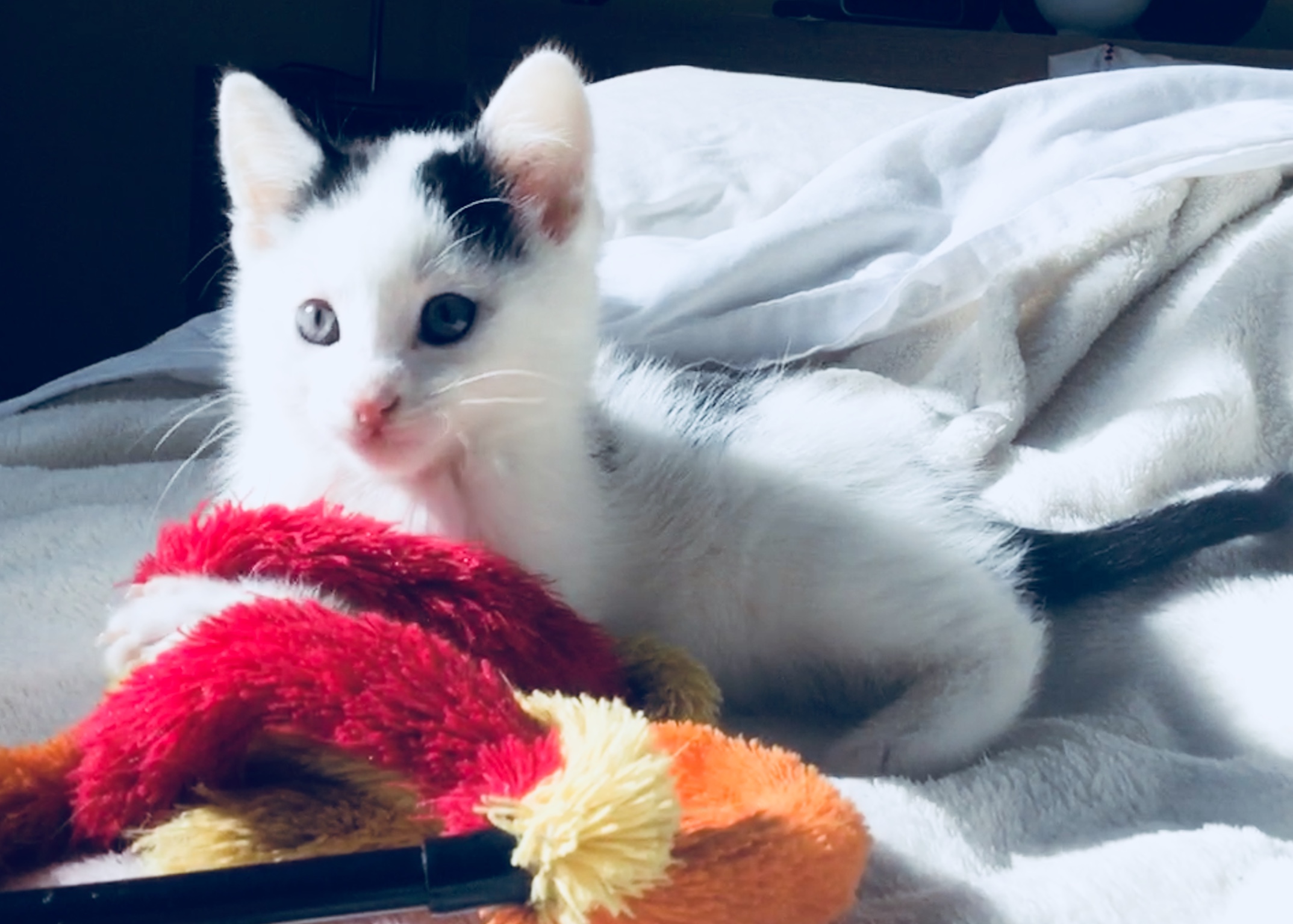 While still quite young, he is so curious and is always searching for the next fun thing to play with. He loves human interaction and when he hears the front door open he's the first to greet us or our visitors and to see who will play with him next.
