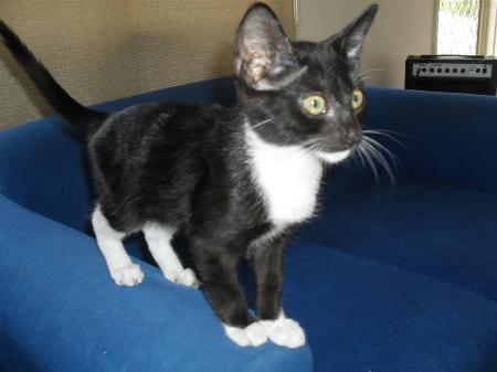 Penguin is very affectionate, he loves to cuddle at night and first thing in the morning and any other time of the day when he is not playing, eating or sleeping. Penguin is a gorgeous kitten, friendly, out going and with a super meow. Pengiun uses his litter tray perfectly he also loves to eat. At the moment he does not mind having a bath, but that might change when he gets older. If you would like to give penguin a forever home please give us a call. Emails are not regularly checked so please phone