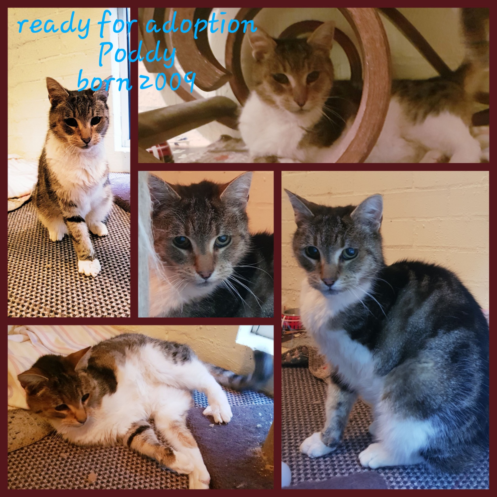 Poddy came into care as a 3 legged cat.His previous owner told us he rescued him from a rabbit trap as a young cat and took him to a vet who amputated his left front leg from the shoulder blade.