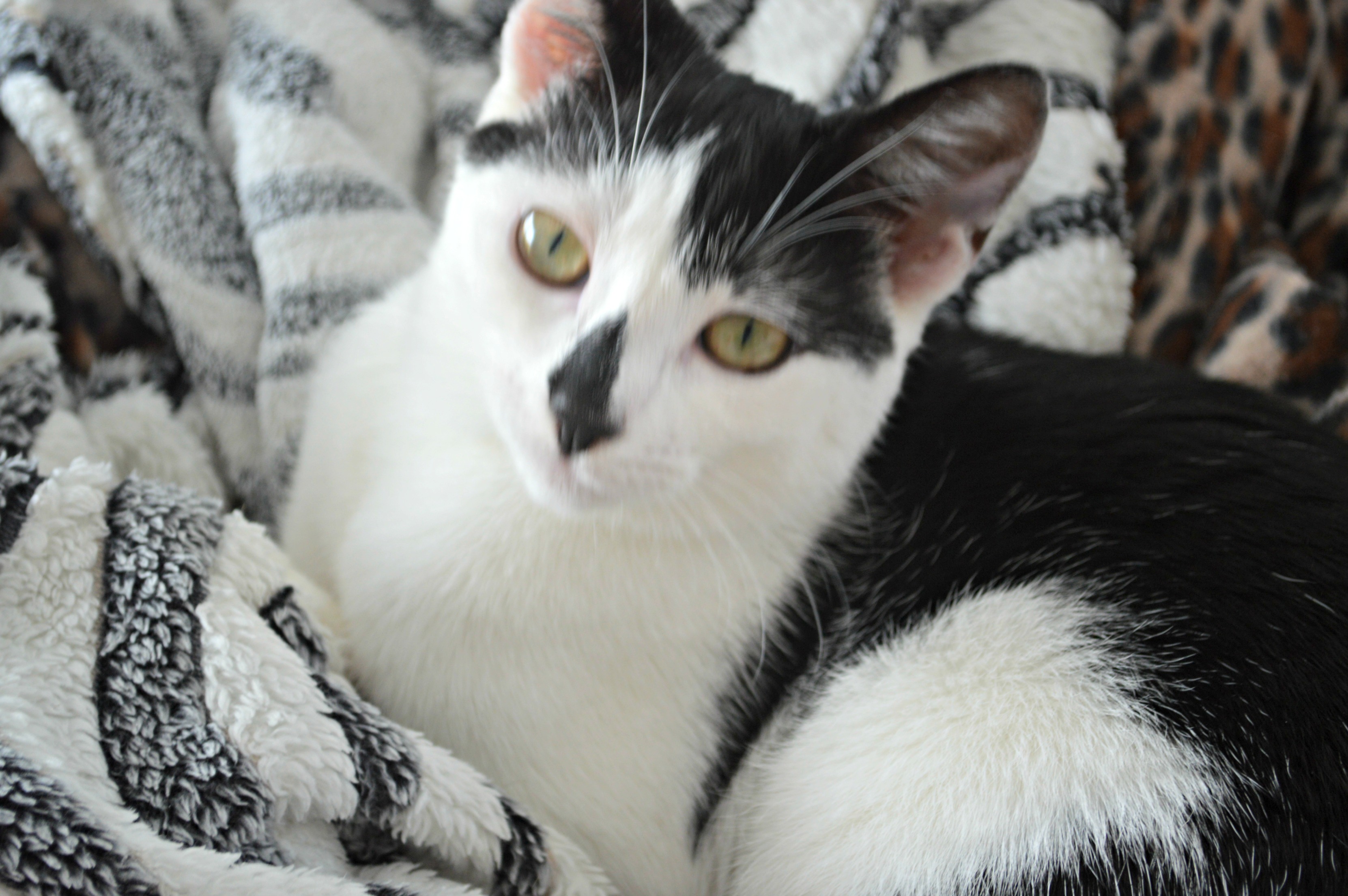 Minnie is very lazy docile cat. She is like a female Garfield. Minnie is very sneaky and often will eat tigi food, so they have to be fed separately. Minnie loves her head touched and is great with kids once she's warmed up to them. Minnie doesn't like her body touched much and isn't particularly keen on getting brushed. Minnie doesn't like to play with toys much. Minnie likes to head-but me which I think is really cute. She's very affectionate and loves her cuddles also. Minnie doesn't mind a rough pat like you would a dog she fine with it but tigi doesn't like it. Minnie also loves to sunbaked but can get sunburn due to the pink areas on her ears. Minnie I named after Minnie Mouse as when I adopted her from a cat shelter she was very skinny and underweight.