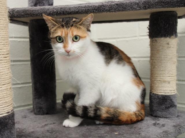 Daphne is a very pretty and lovely 1 year old domestic cat who is available for immediate adoption. She has beautiful calico markings and an awesome striped tail! ♥