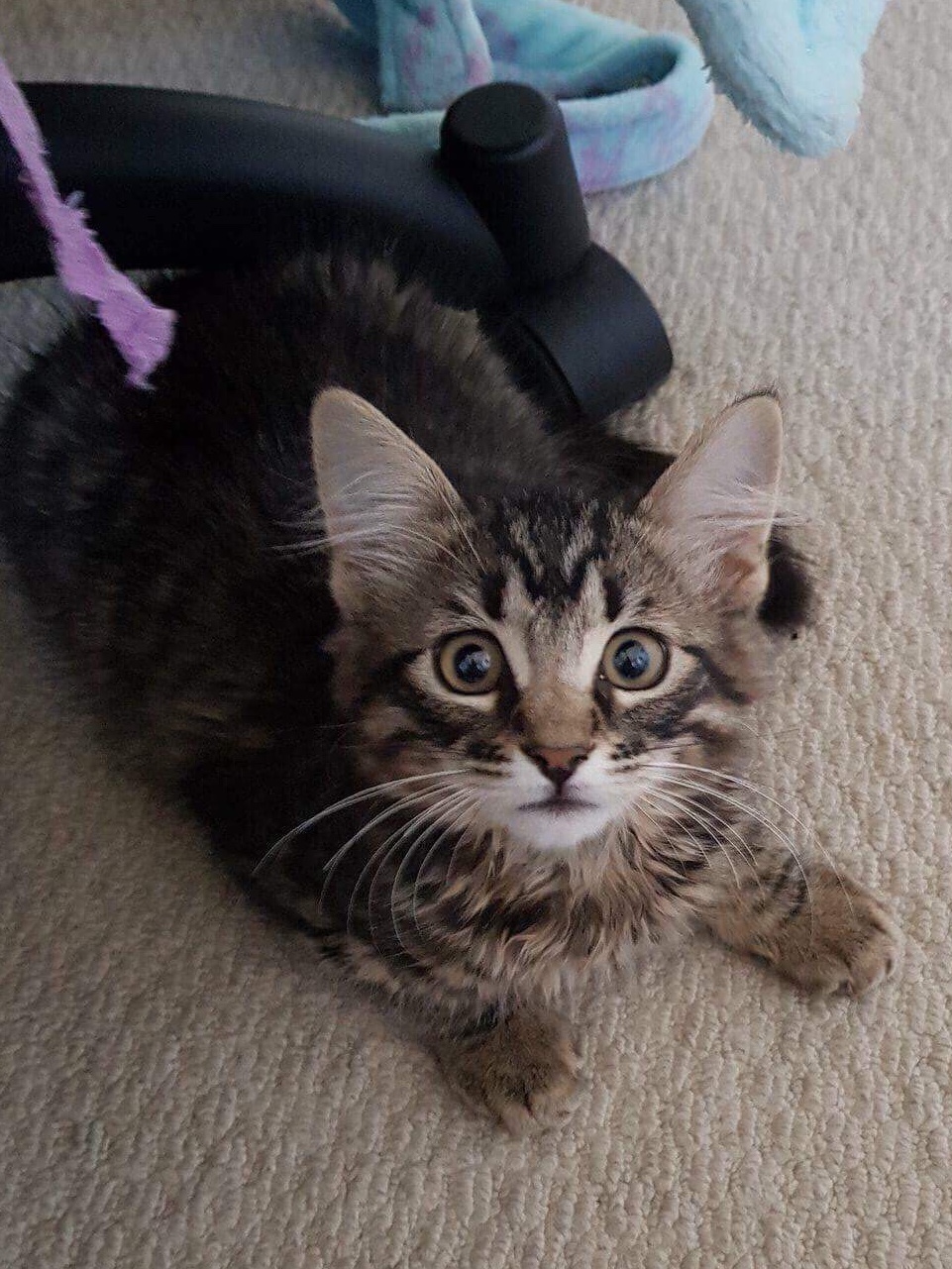 Mr Sniggles is one the friendliest little kittens you will meet. He is very confident and extremely loving. He is currently housed with other cats and two dogs. He is forever trying to give them all cuddles. When you scratch him on his head, he will push onto his hind legs just so he can get more pats! Mr Sniggles will suit a home with younger children with an awareness of animals. All he wants to do is sit on your lap and sleep curled up next to you.