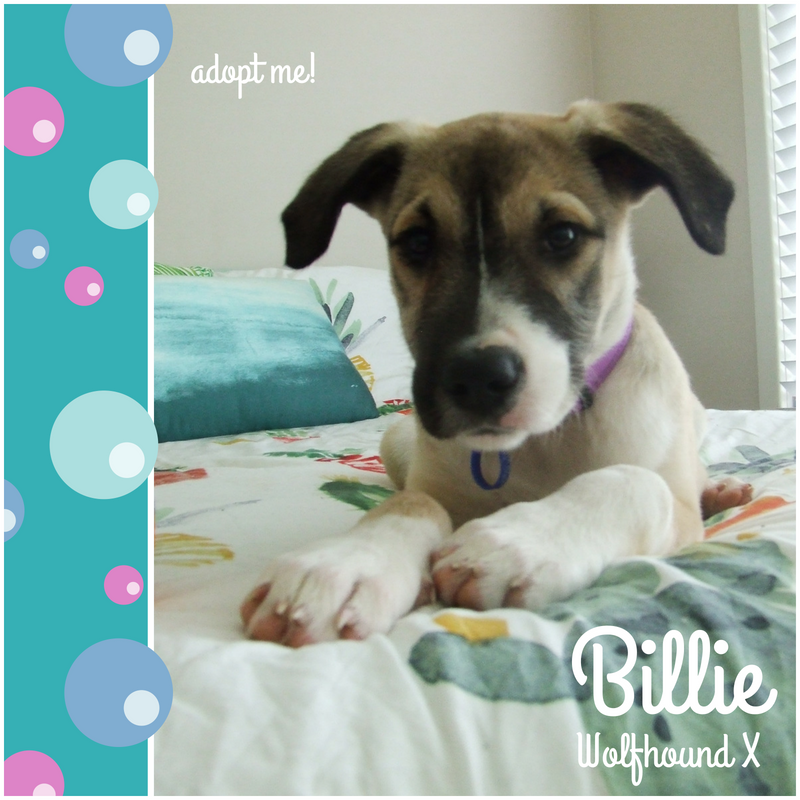 Hi, my name is Billie! I’m a 4 month old Wolfhound x Bull Arab x Staffy x Kelpie. I am a very fun loving, super friendly pup. I’m always up for cuddles and I love giving kisses. I am a little shy when I first meet new people, but them surprise them with a burst of energy when I begin to feel comfortable with them. I love to play and be around people, but also enjoy my alone time and am happy to just take a nap. I get along with other dogs and young children. I don’t jump on them as I know to be gentle.