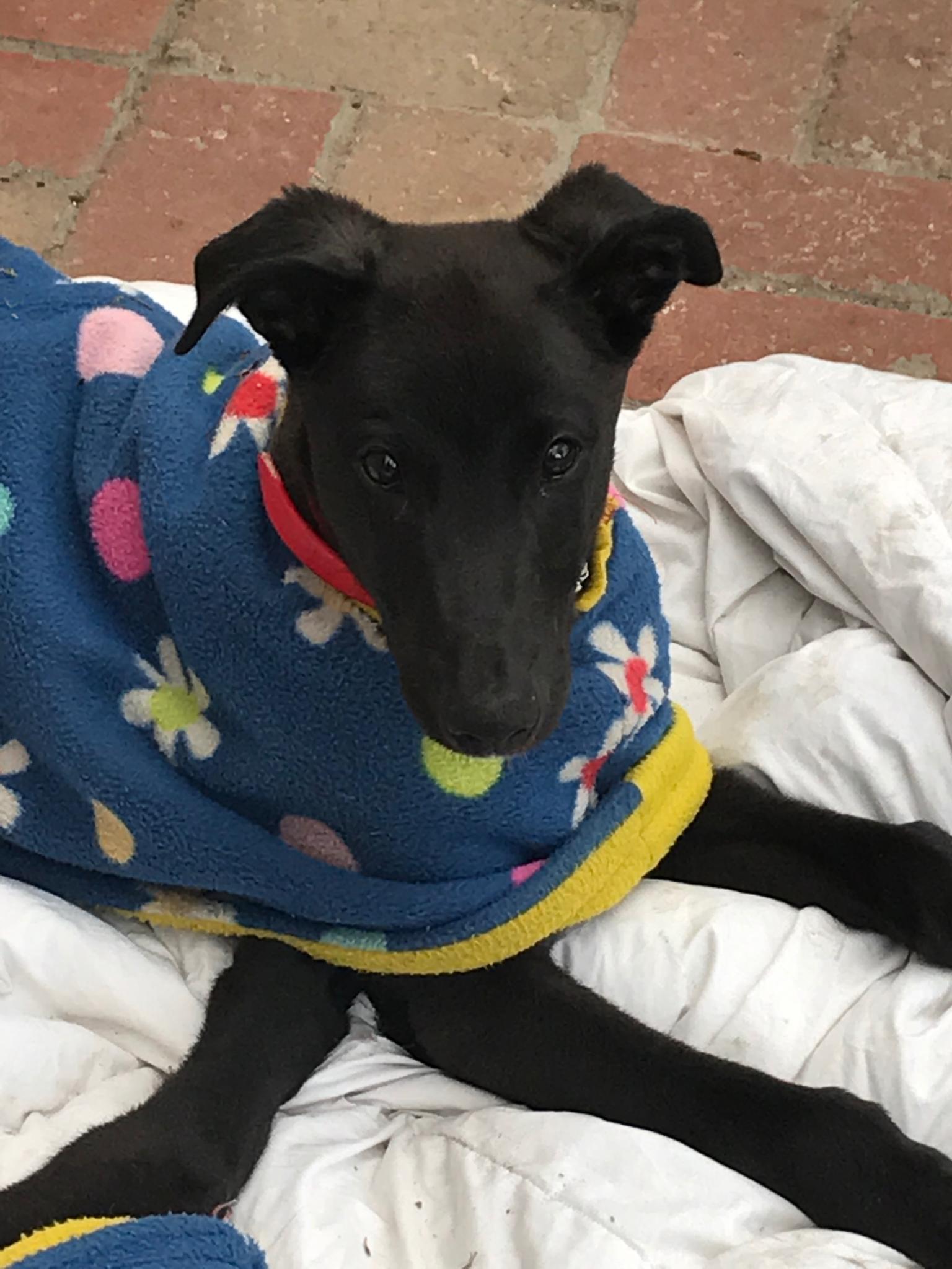 Mickey is a gorgeous 14 week old greyhound puppy. He is black with a small patch of white on his chest. He loves cuddles and pats and like all puppies he likes to keep busy exploring the world.