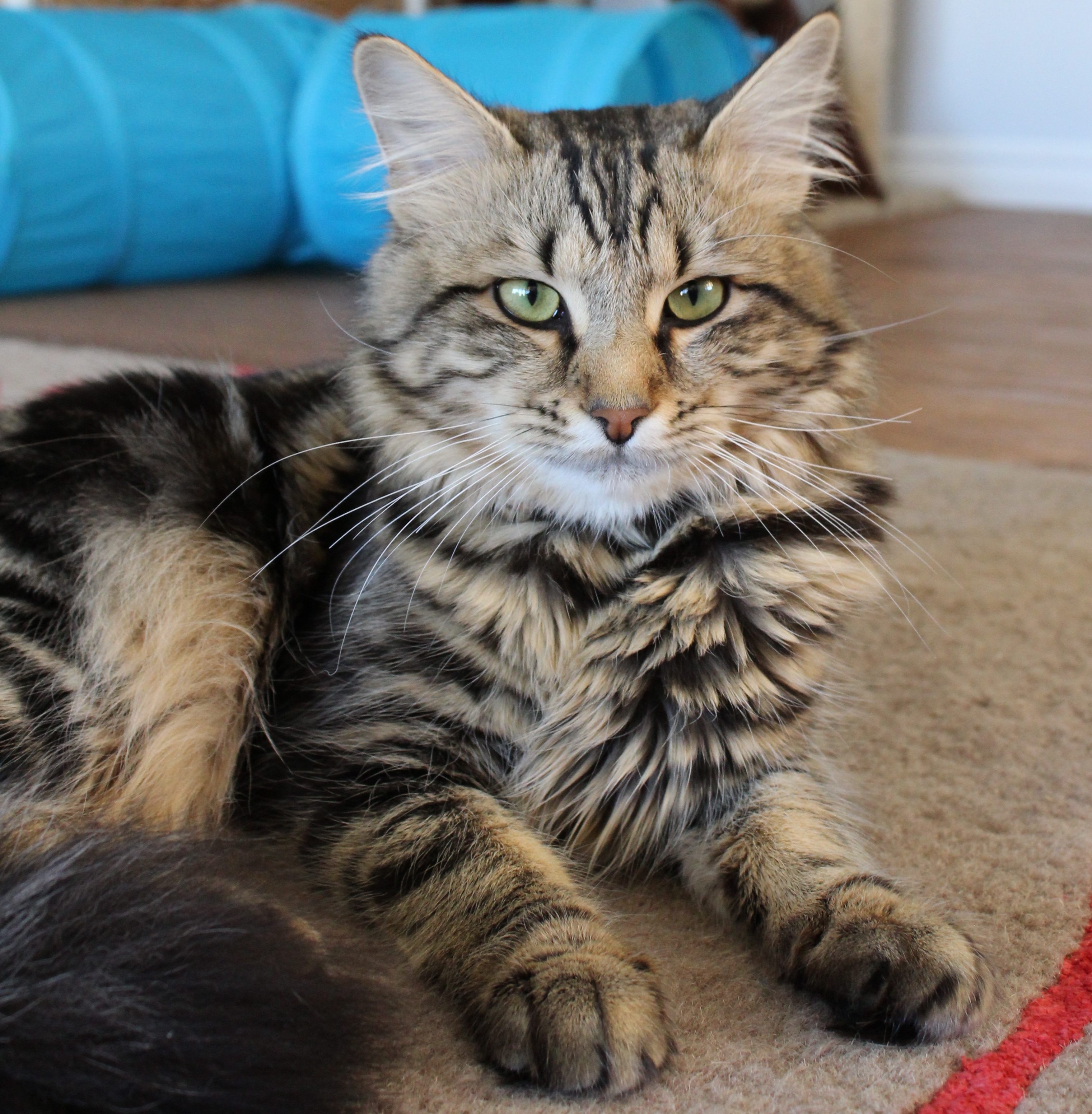 James is a handsome boy and he knows it! He loves attention, enjoys being held and stroked - he has an amazing soft coat. He is very playful but also loves to curl up and snooze. He loves his food - to the point where he will tell you when he is hungry and not leave you alone until you have fed him! He is currently fostered in a home with teenagers, dogs and cats. We feel he has not had much experience living with other animals and is still adjusting to it, but is doing well so far. James is litter trained. This boy is beautiful and will make a wonderful addition to your home.