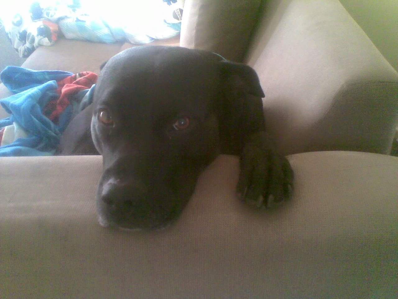 Zander is a sweet cuddly quite bullarab x he has claimed the end of the couch as his bed .
