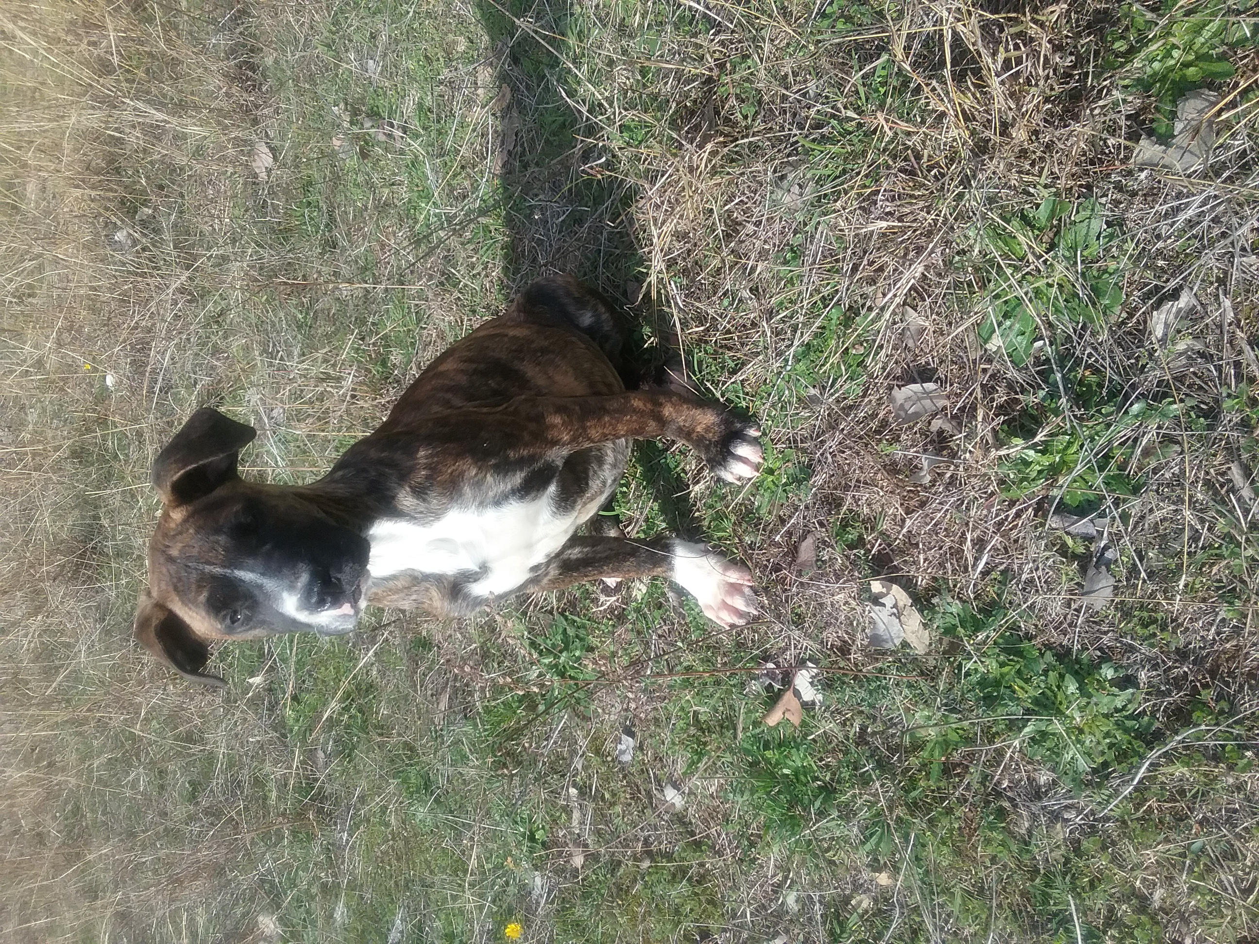 By her looks an mannerisms and colours we believe she is boxer x mastiff.
