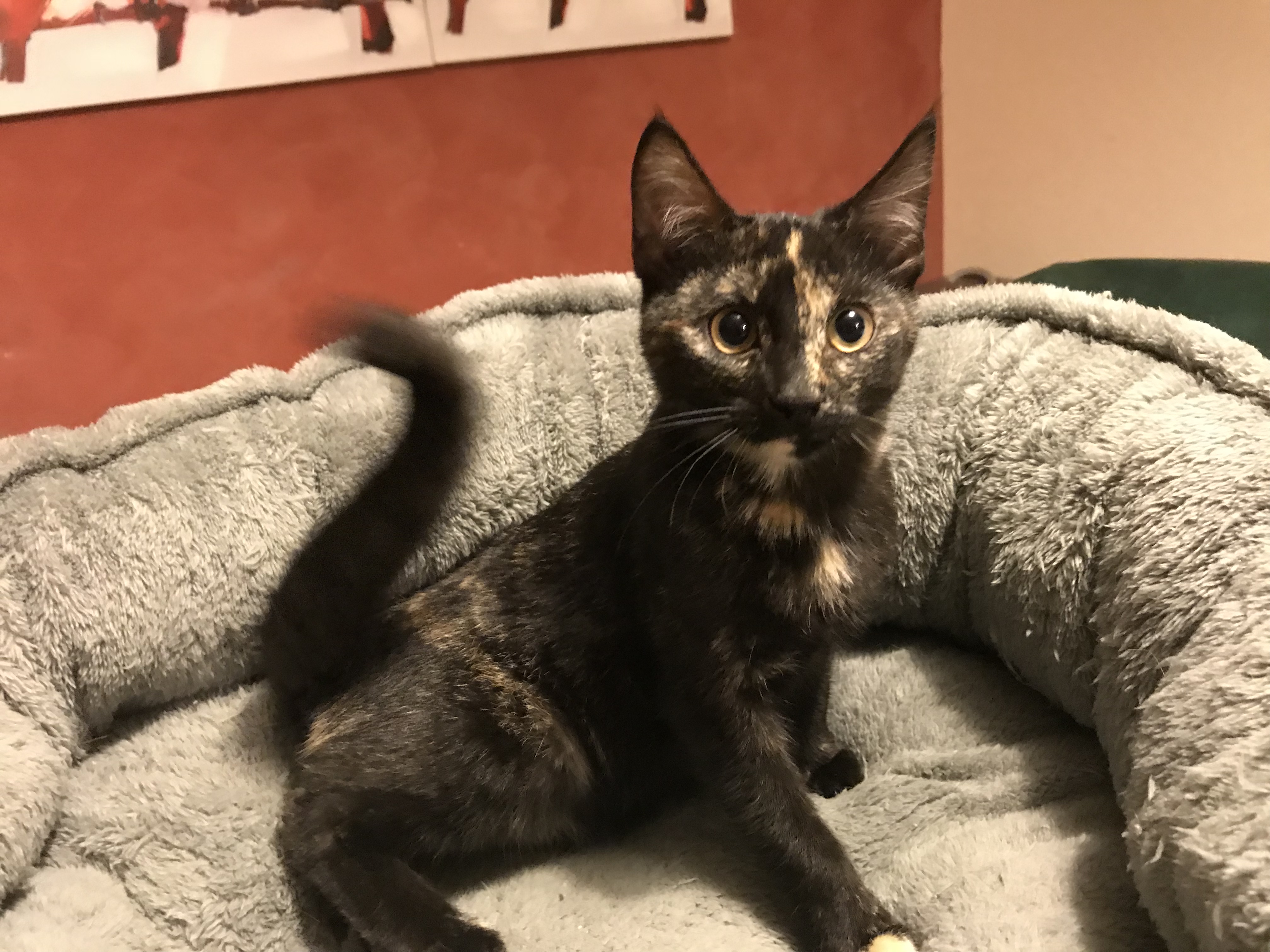 Afia is a sweet little kitten who loves to cuddle and play. Afia lets the other kittens get their attention first before she gets her share but is still outgoing with new people.
