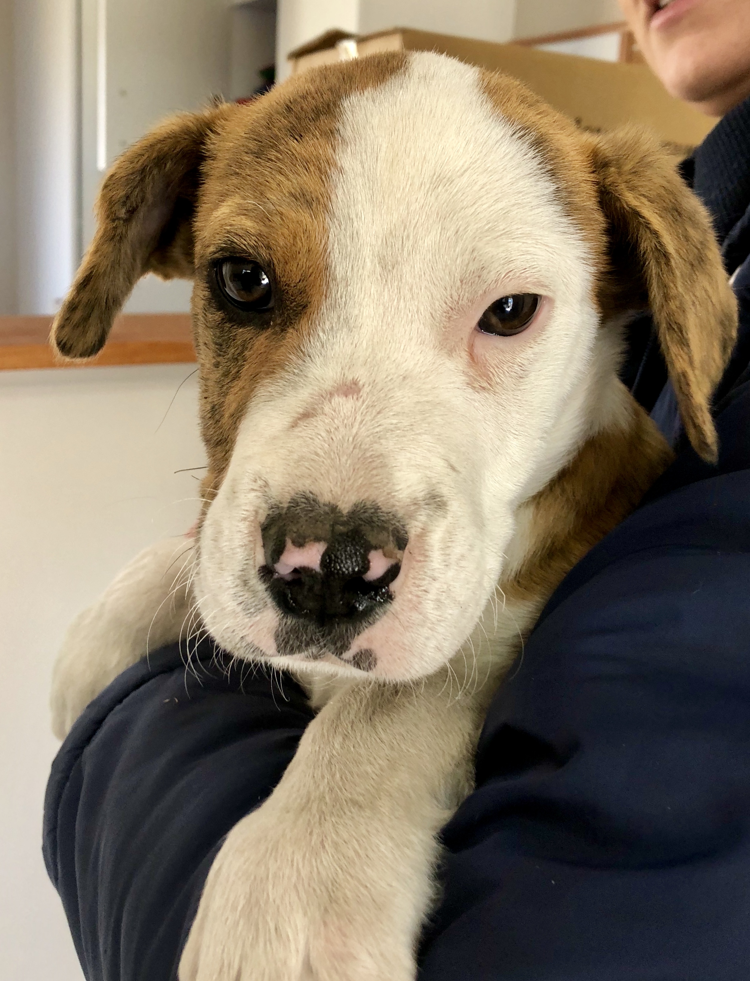 Peachy found himself at the pound with his brothers and father. His father is a mastiff x beagal. Mother was a staffy. So quite an interesting mix! Peachy will likely be a medium sized dog, between 20-25kg. His current weight is 6.9kg.