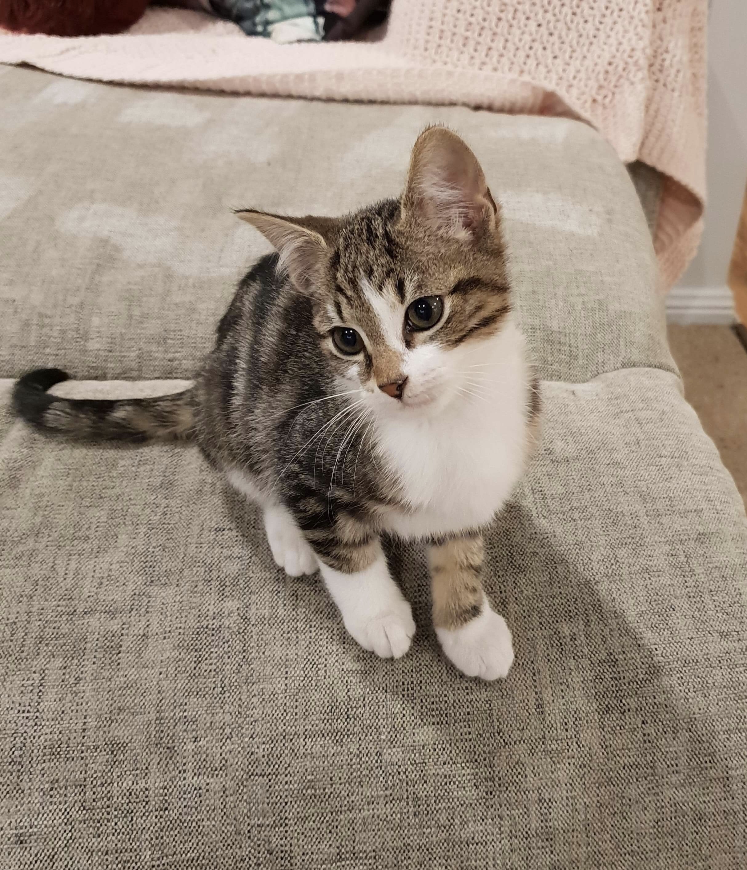 Like all kittens he can be a bundle of energy one minute and a little ball of purrs the next.