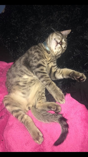 Cheeto is more like a dog than cat. He will follow you everywhere & come running to greet you when you walk in the room. When he’s happy he wags his tail so hard his whole body wiggles! He loves to “talk” & will chirp at you when he wants attention! He loves being cuddled, will happily sit on your lap & sleep under the covers with you. He needs a soft blanket to suckle on at night! He will sit & wait patiently while you prepare his dinner & understands “wait”, “no” & “gentle”. Very clever kitty who demands LOTS of attention! Has been well socialised with 4 full grown Bengals & 2 baby kittens