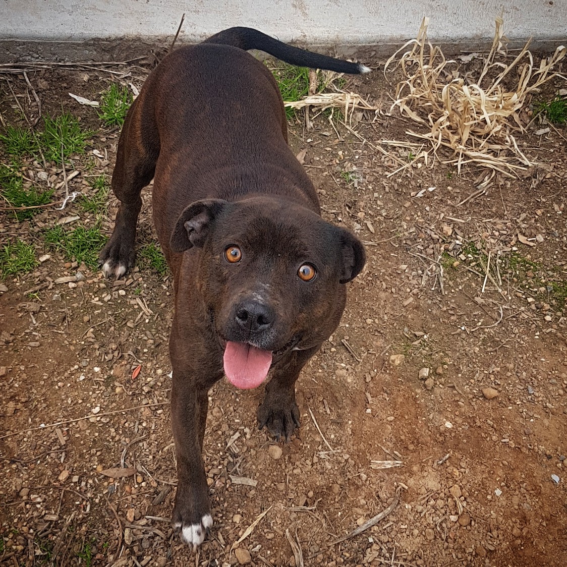 In typical staffy style, Fudge is full of happy energy, her entire body from her shoulders back wiggles when she wags her tail, which is more like a propeller than a wag!