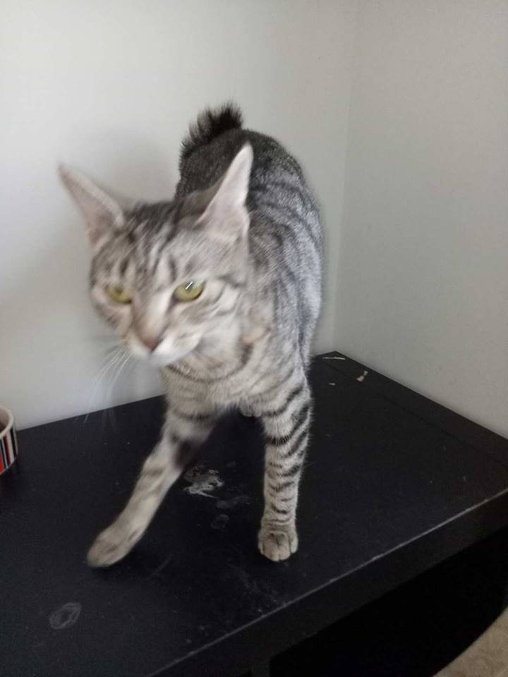 Hello. I am Gina. I am a Manx X, this means I have no tail. Though my sister Mona has a full tail, that is where the cross part comes in. Mona and I come in together but she has found her forever home, so it is just me looking now. My coat is a lovely soft gray and I have darker gray and black tabbie markings, with some white features. I am a pretty girl….or at least I think so. I would love to find my perfect home and find a family of my own, like my sister has done. If you would like to meet me and maybe take me home, please contact the rescue.