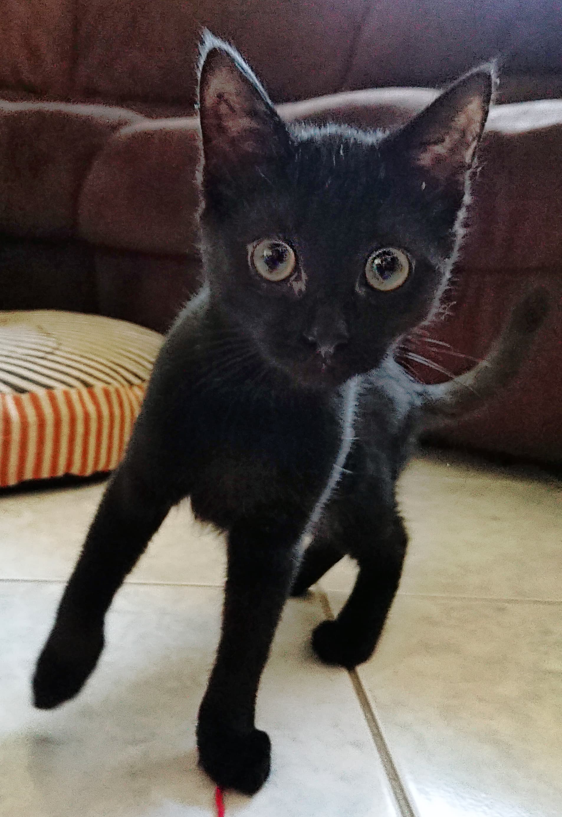 Hi I'm Licorice. I am a stunning, spunky, happy and playful kitten full of cattitude, who loves attention. I am incredibly playful, always waiting to chase balls or bat toys, adventurous and love to run around inside or sit and watch what's going on around me. I enjoy chin scratches and ear rubs when I have finished playing. I happily live in foster care with other cats/kittens, dogs and my big and little foster carers. My Mumma and I were trapped and bought into care when I was only 2 weeks old. We were gravely ill, but with 24 hour TLC for many, many weeks by our special foster Mumma I am fit and healthy and I am now ready to find my own special home. Being I was my Mumma's only kitten and I was so ill requiring medications, I can still play a little rough, but I'm learning. I love to lay on your lap having scratches once I've finished exploring and playing. I am an indoors only kitten, but I love it best there because I feel safe and love being near my family. I will fit into any kind of home with some time and patience to adjust to a new environment and when settled I will give lots of love and kitty cuddles.