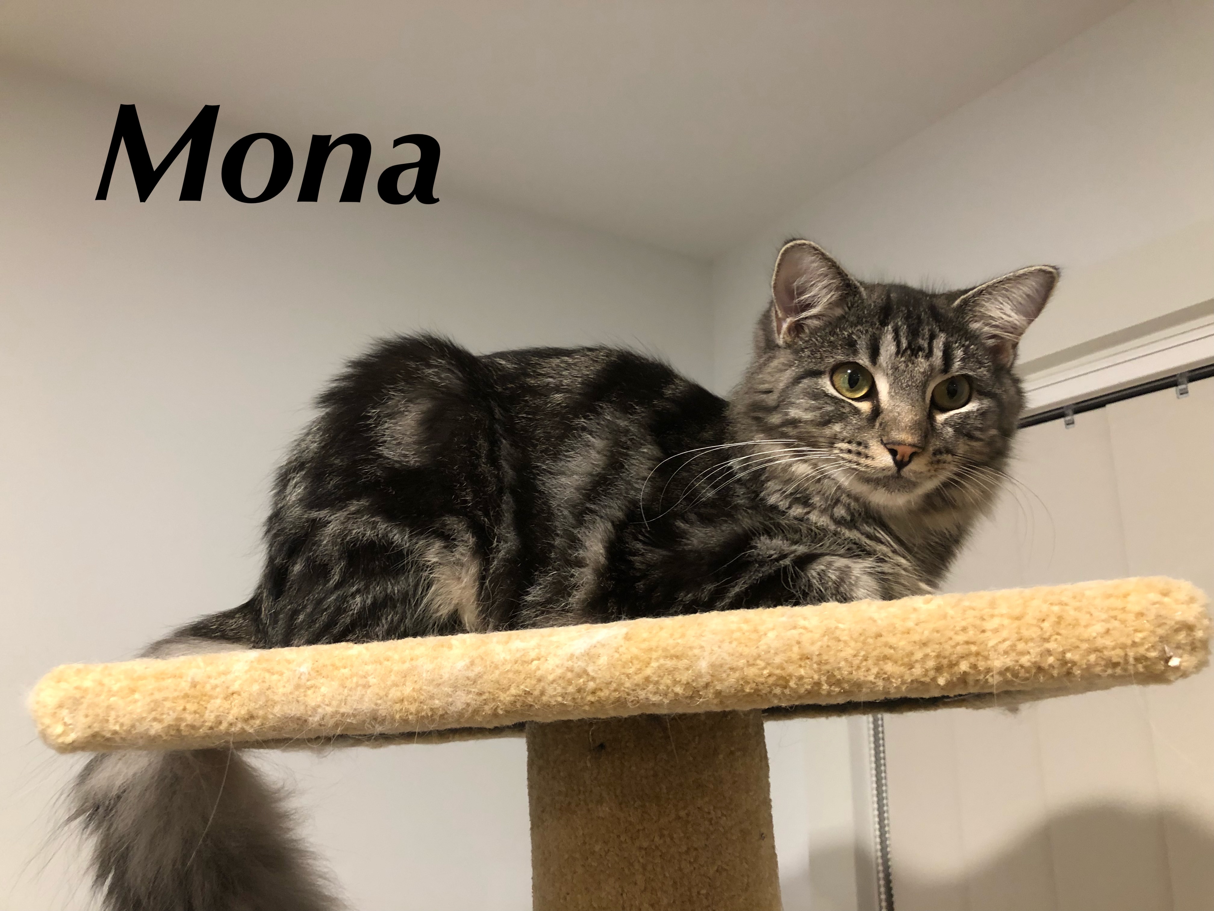 Mona is a little pocket rocket! She may be small for her age but don't let that fool you, she is energetic and has the purr of a lion. Mona gets along well with other cats, although has not been introduced to dogs or children yet. She will follow you around like a little shadow, loves all the pats and will even give you little kitty kisses. She would be perfect for anyone wanting lots of smooches and a great companion. Mona is available for adoption with her purrfect brother Monte.