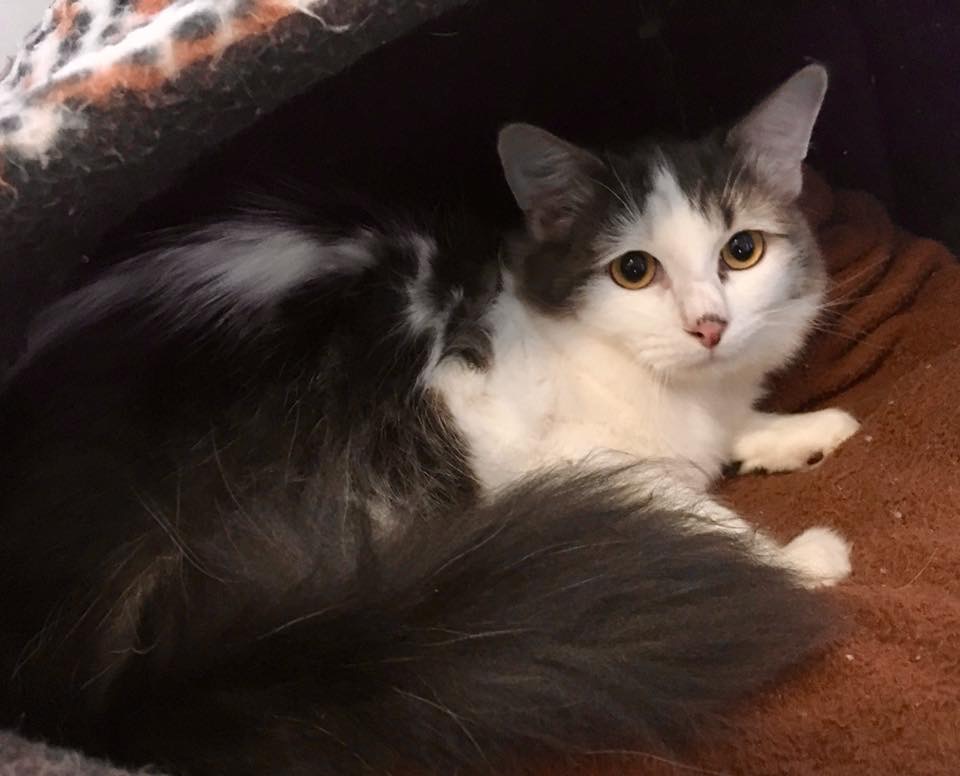 Say hello to Elsa, female, grey and white), she is a beautiful kitten who is very sweet and loving and is great with other cats. She comes across as shy, but she is very loyal and affectionate and loves to sit on your shoulder and lap once she’s used to you. She would suit a home with children over 8 yrs old. She is desexed, microchipped, vaccinated and flea and worm treated.