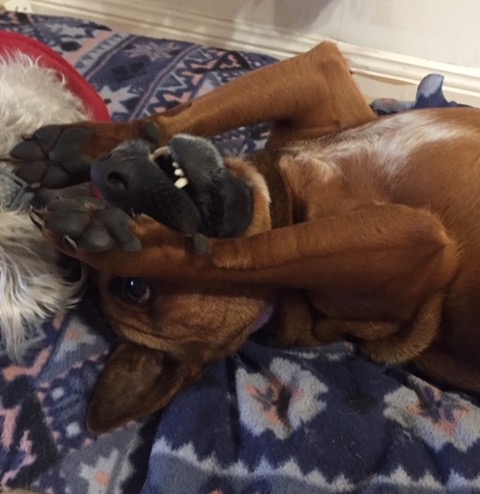 Ruby plays very well with her foster sister and loves to play ball or tug. She loves her food but is still very respectful of her sisters food.