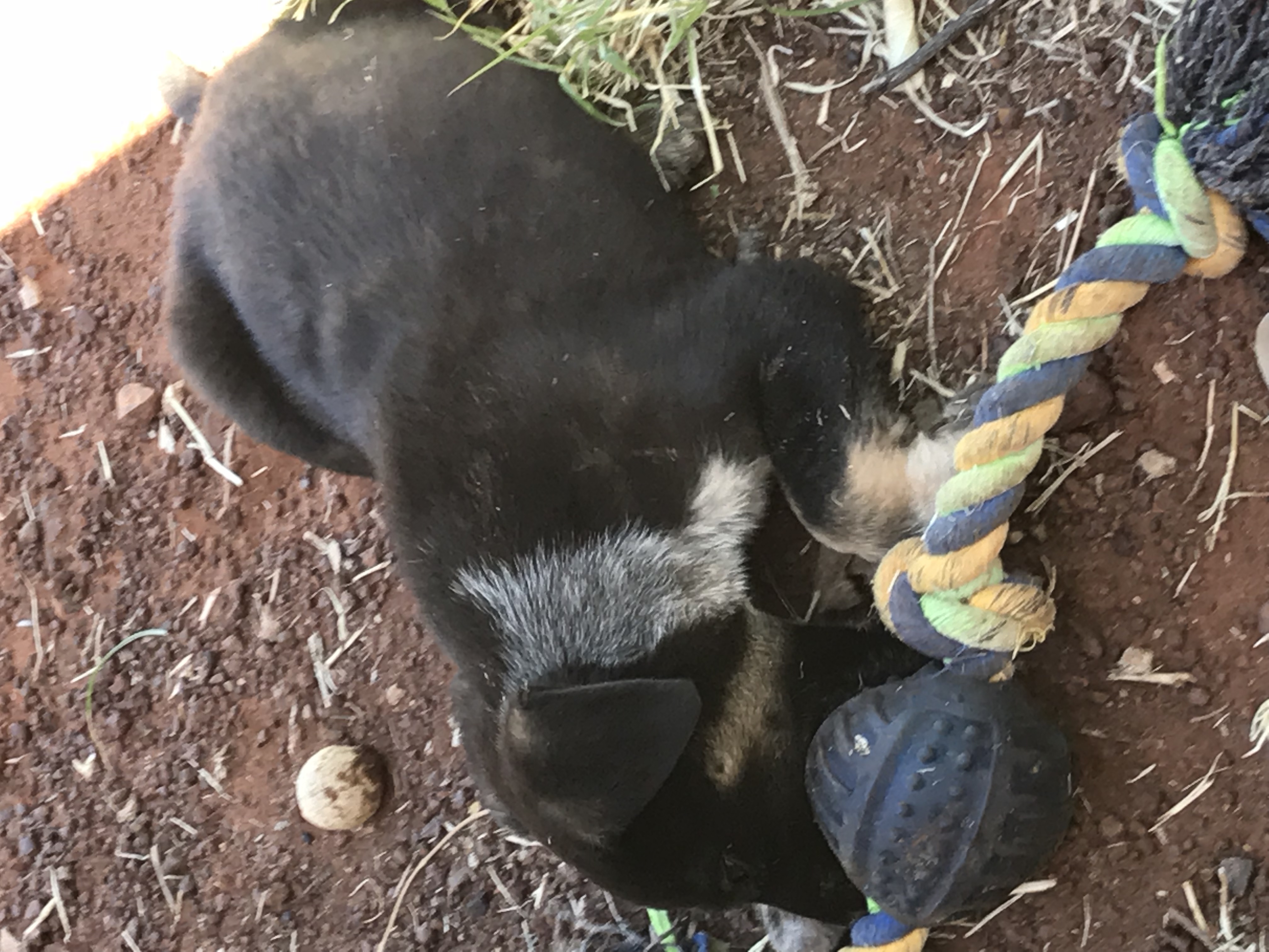Arrow is a really lovely little guy. He is one of a litter of 10 puppies, and they all have really beautiful temperaments. Arrow loves to explore the natural world and play with sticks and leaves, but he also likes to have a game of tug with the puppy toys. Sometimes his mum takes his toy off him and it is really funny to see him running after her, yapping and telling her off. Arrow is a calm, confident , cooperative puppy. He can amuse himself with his toys or his littermates, but also loves a pickup cuddle as well. Some of the pups have really short sleek coats, but Arrow is a little bit fluffy and very soft. His mum is a lovely dog, and he takes after her.