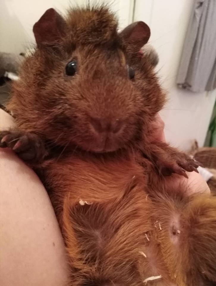This fella came from a home where there was a very large number of piggies all breeding out of control. None of them were handled by their owners and they often didn't have enough food and water plus it got pretty dirty in there (they were all free-roaming in a shed).