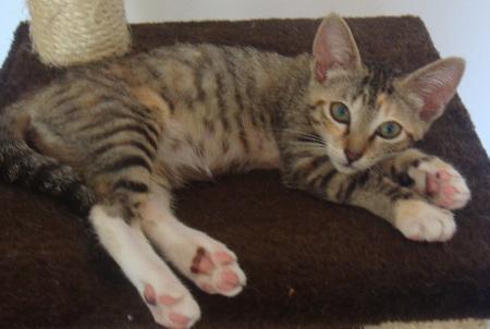 she is crazy about playing and simply loves hanging out with patches. She jumps up on my bed herself and plants herself next to me of on my laptop while im trying to do work! she is very social with humans when she wants to be, but she is also happy amusing herself too. She doesnt seem to be scared of us anymore which is the total opposite of how she was when she first arrived a few days ago. She loves her brothers and patches. She keeps trying to make friends with chicka too but hasn't had much success just yet. Im assuming she would also be good with a friendly dog or cat, just like her brothers. Ideal home wise, she would probably be good with just one person, a couple or a family with sensitive, caring children. She isn't as social as her brother frisky, but she isnt anti-social either. She has a placid disposition and just curls up in your arms when you pick her up so i dont think she would ever get rough with anyone. She is very cute!!