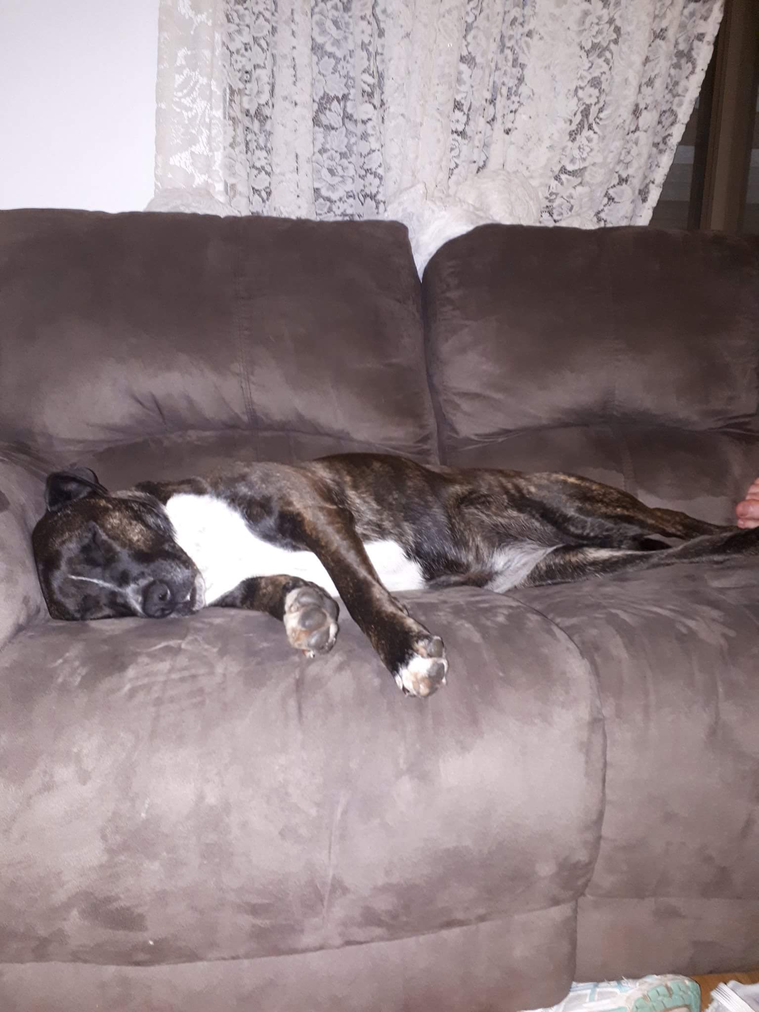 My foster mum says I'm a really sweet girl and I'm very good with the tiny humans too (I like to kiss them and I never knock them over or steal their food). I'm a smart cookie and a very fast learner... I even know basic obedience like sit and shake hands! I will need regular walks- I am still learning not to pull on lead but getting better and better every day... I love treats so I think I'd learn pretty quick. I have a bed but I LOVE to snooze on the sofa- I sleep like a log the whole night. I have lived with a male dog before but would need proper introduction to make sure we get along and play well, or a no dog home.