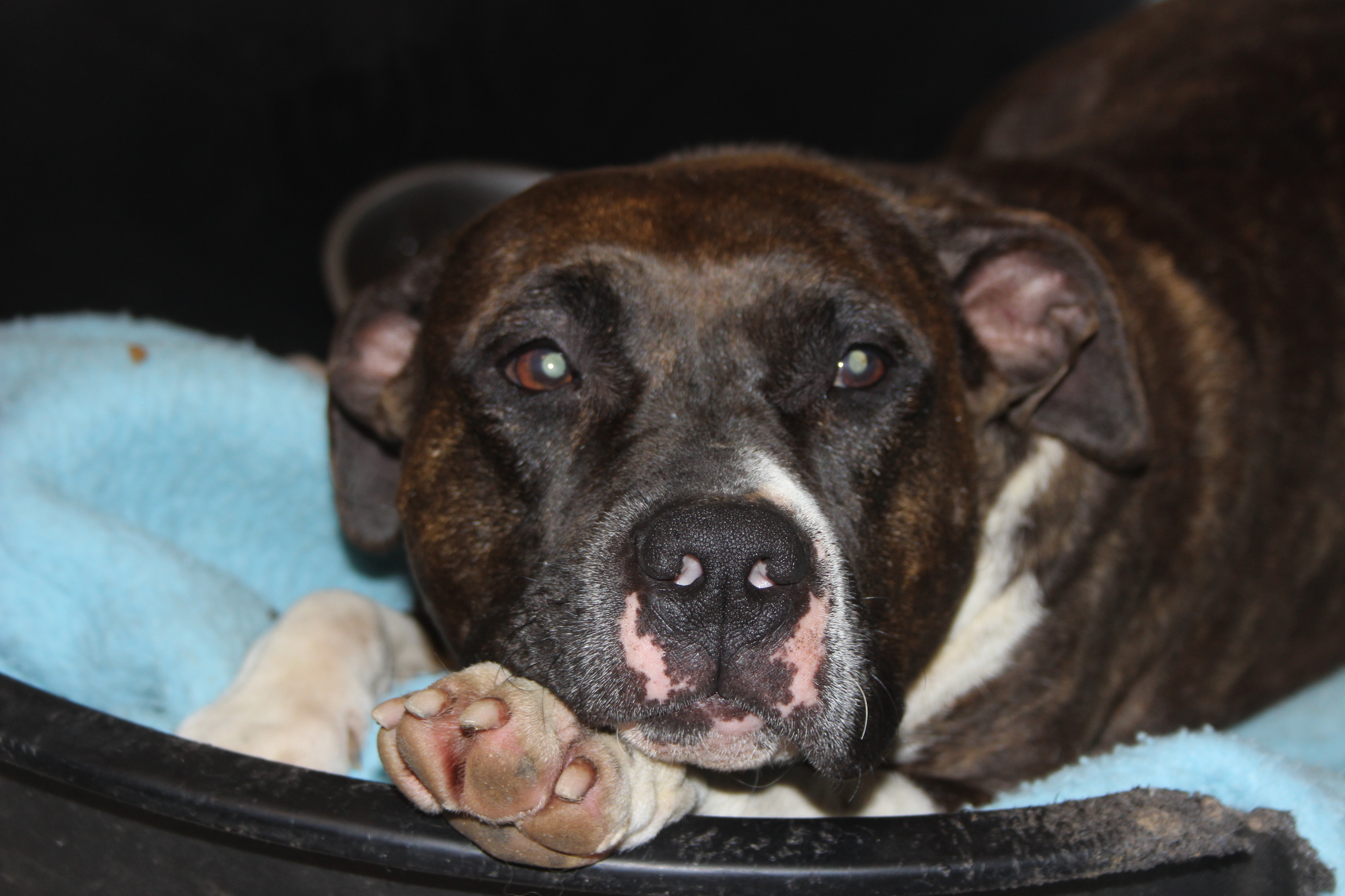 Please meet Rose who is the sweetest girl .. After she spent some time at the vets getting treatment for her dry eye which had been left untreated for sometime she was surrender to dog rescue. She has had more than one litter of pups and hasn't had the best of life but she is enjoying it now and having a great life in foster.