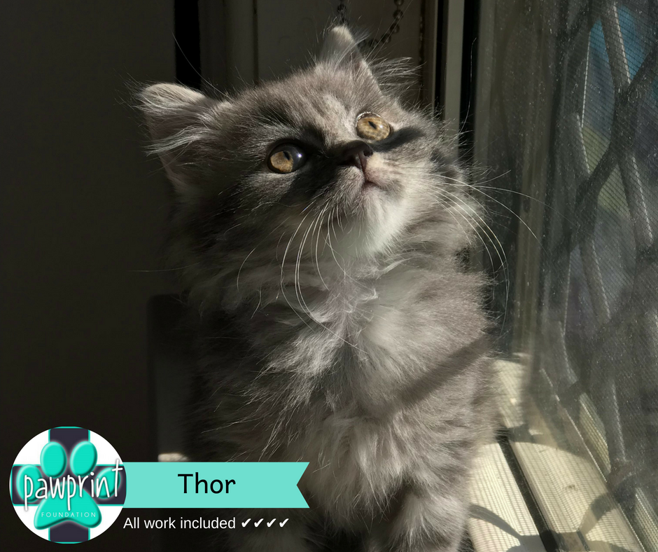 Hello. I’m Thor and I’m 11 weeks old. I’m a little, fluffy ball of energy who loves to play with anything left on the floor. Both my mums family and my foster family have kids, and I love having everyone to play with. I’m still a little guy, so I get tired easily and love to snuggle to sleep. I love scratches under my chin and will pull your hand up to my chin to show you where I like it. I have a loud motor and I give little kisses when I really happy