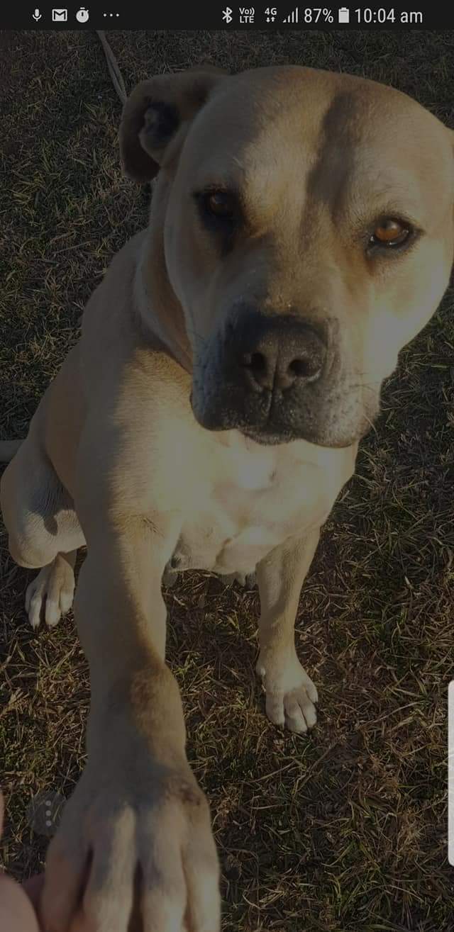 She is a big ball of personality and loves playing tug of war. Absolutely loves playing with kids on the trampoline Mastiff looking head but not a stocky body. She hasn't been in a yard with a dog but always seems keen to play with them and doesn't growl. A beautiful girl. She is a bit of an escape artist though.