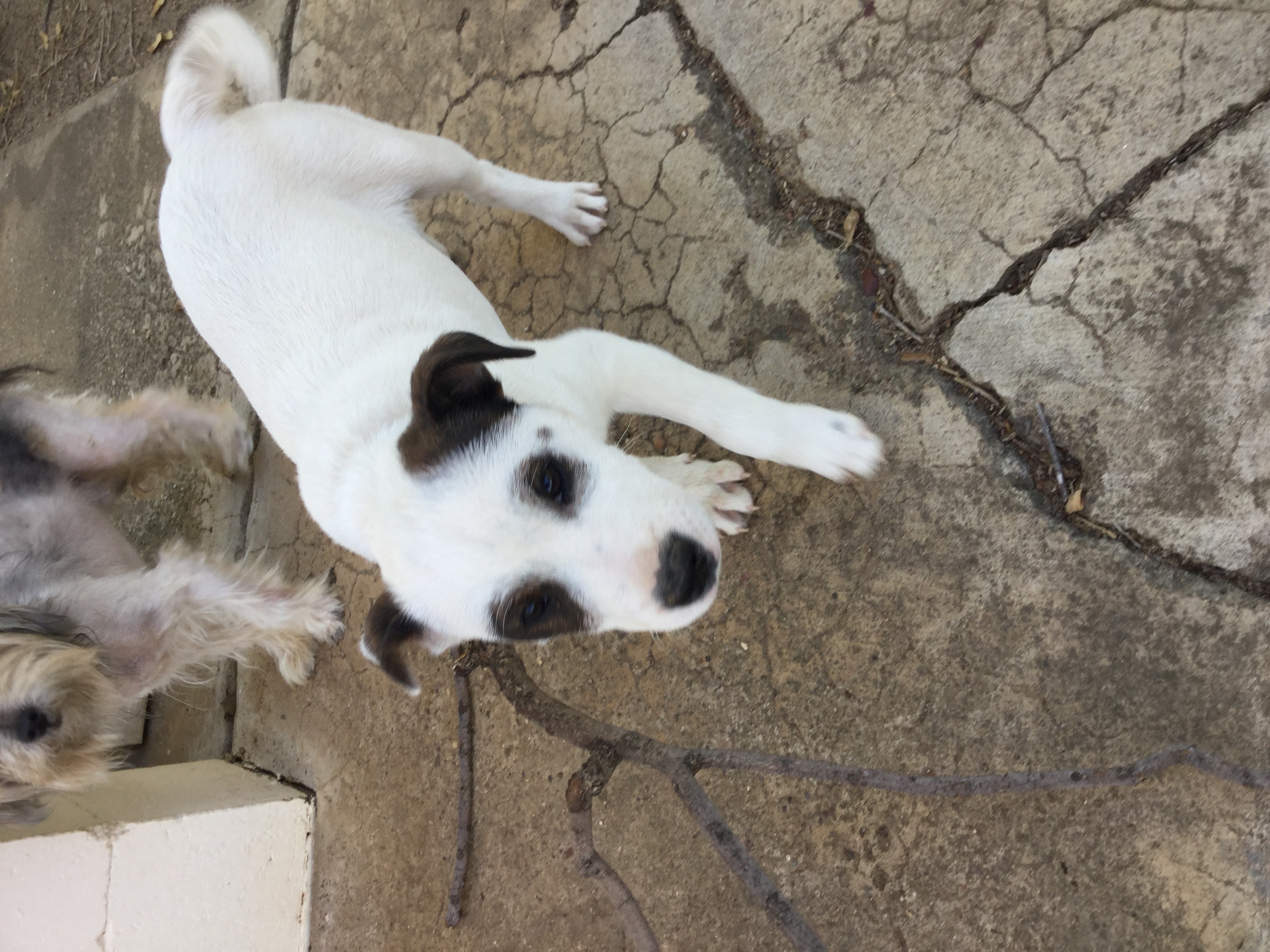 It’s believed he’s a Jack Russell mix, but we have no idea what else is in his makeup. He doesn’t have thumping big paws or build, so we are fairly certain he will be a small medium when fully grown.