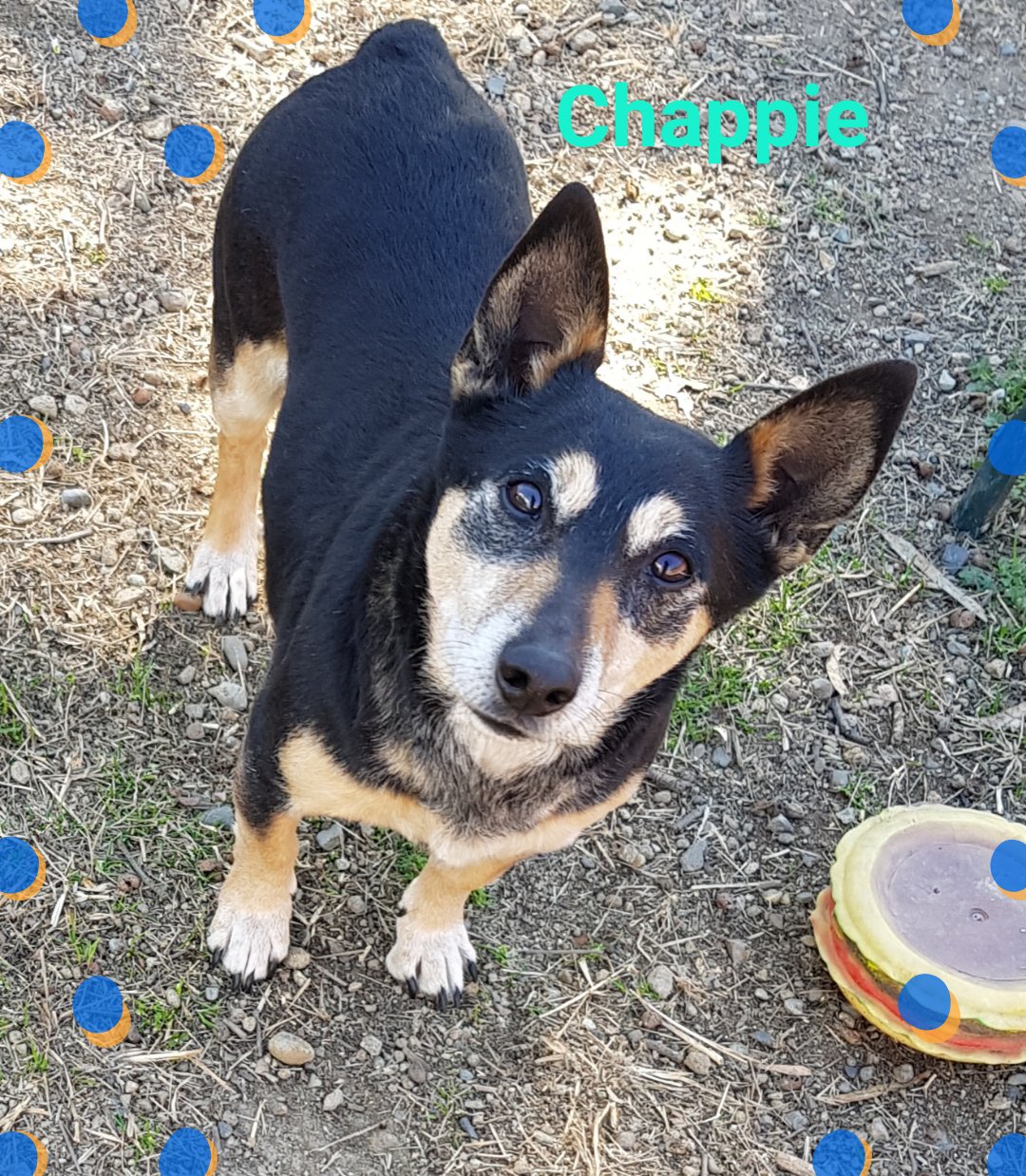 Chappie is a delicious little fellow. We think he is a Foxy x Melle. He is the size of a Corfu. Chappie is estimated to be about 7-8 years old. He is a very chilled guy who doesn't make a sound and is happy to go wherever you are going. He adores having pats and cuddles! He's a very low maintenance dog who is dog friendly as well.