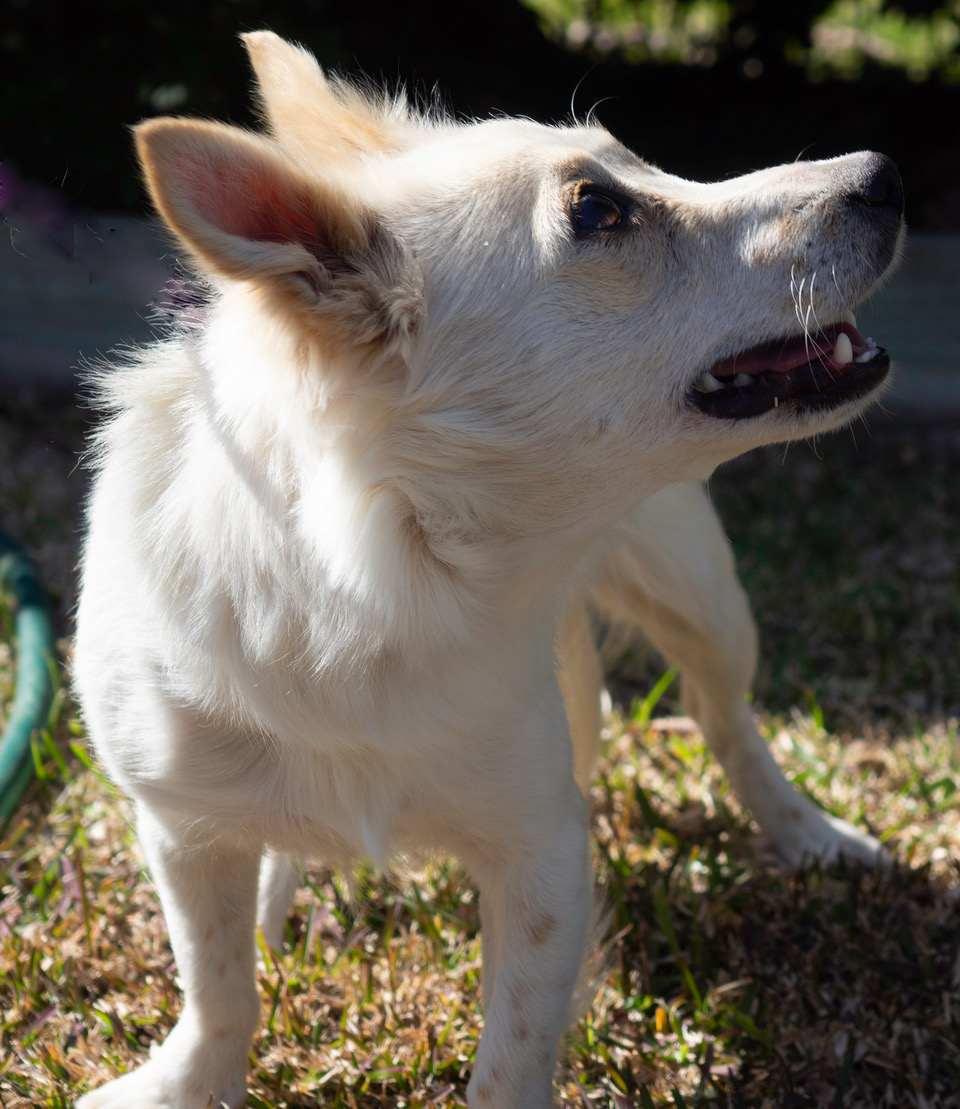 Oh my goodness, she is an absolute delight! Friendly and loving with both humans and all the other dogs in my care, she basically just wants to be near you, whether sleeping on your lap, or helping out in the garden. She has learned to use the doggie door and is progressing well with toilet training.