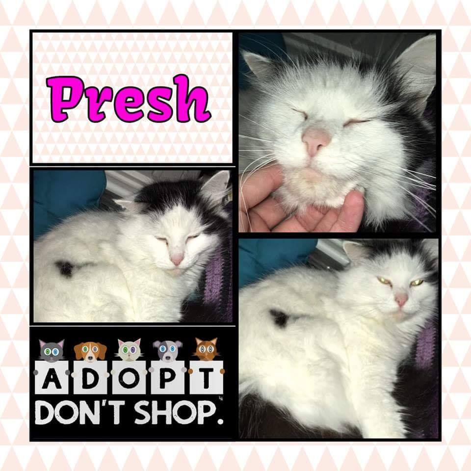 Presh was brought into care as a housing trust complex that had been condemned and the lady who owned about 15 cats and kittens had left them all behind to fend for themselves.