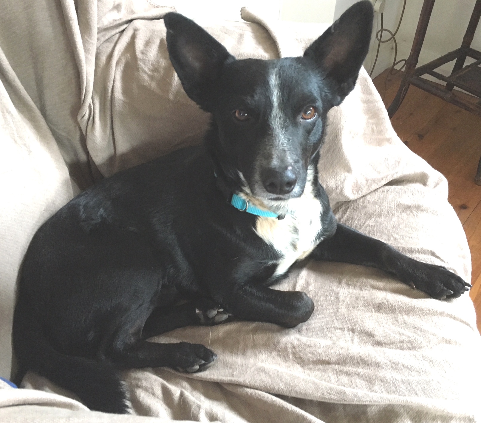 Con's shape suggests a Kelpie on short legs and a foxie personality who knows?? and we estimate he is about 18mths - 2yrs old. He is a sturdy boy but not fat weighing approx. 12kg.
