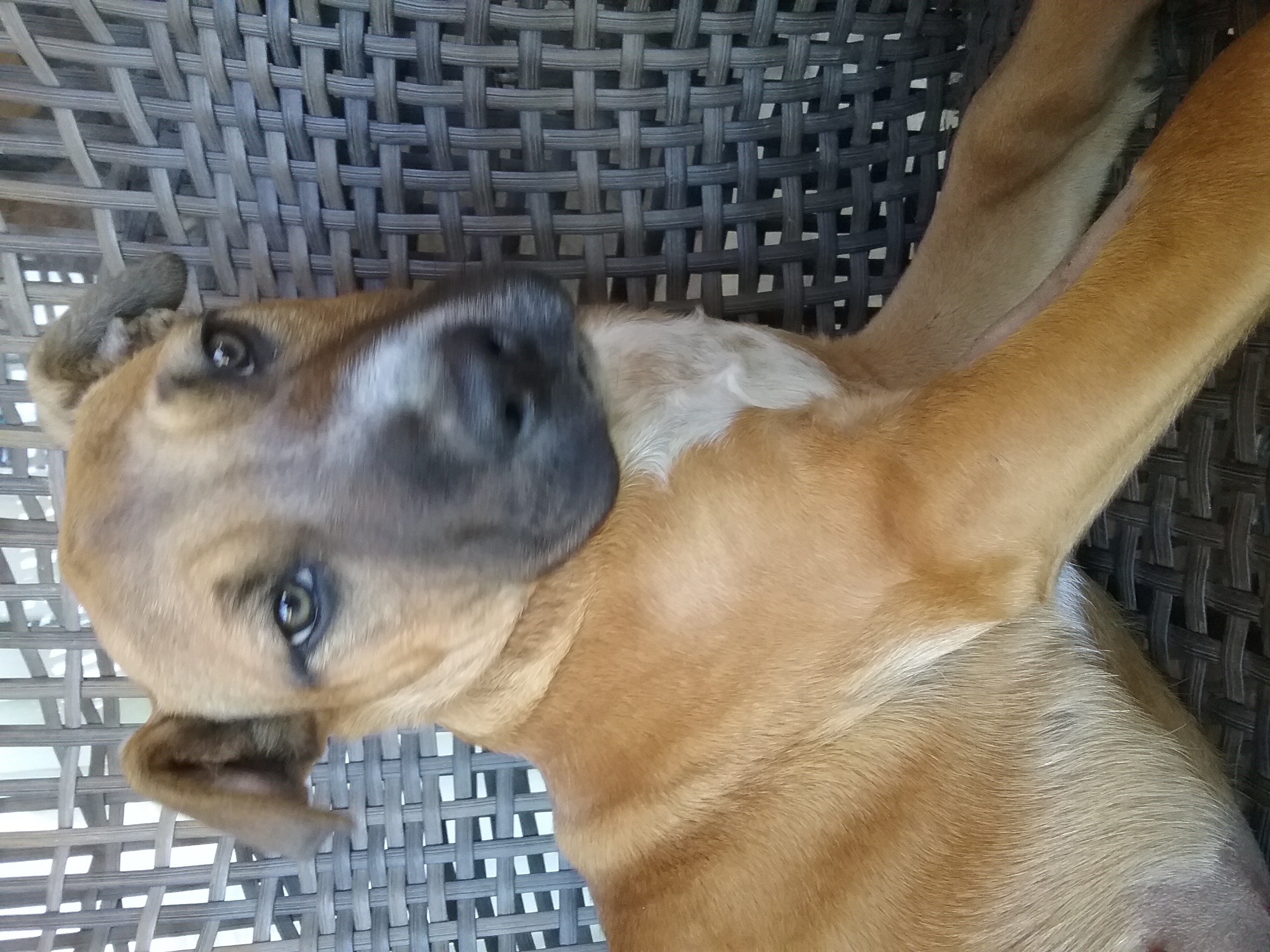 Guessing this sweetheart is mastiff mix being a puppy not suited to be home alone all day would need a pooch playmate.