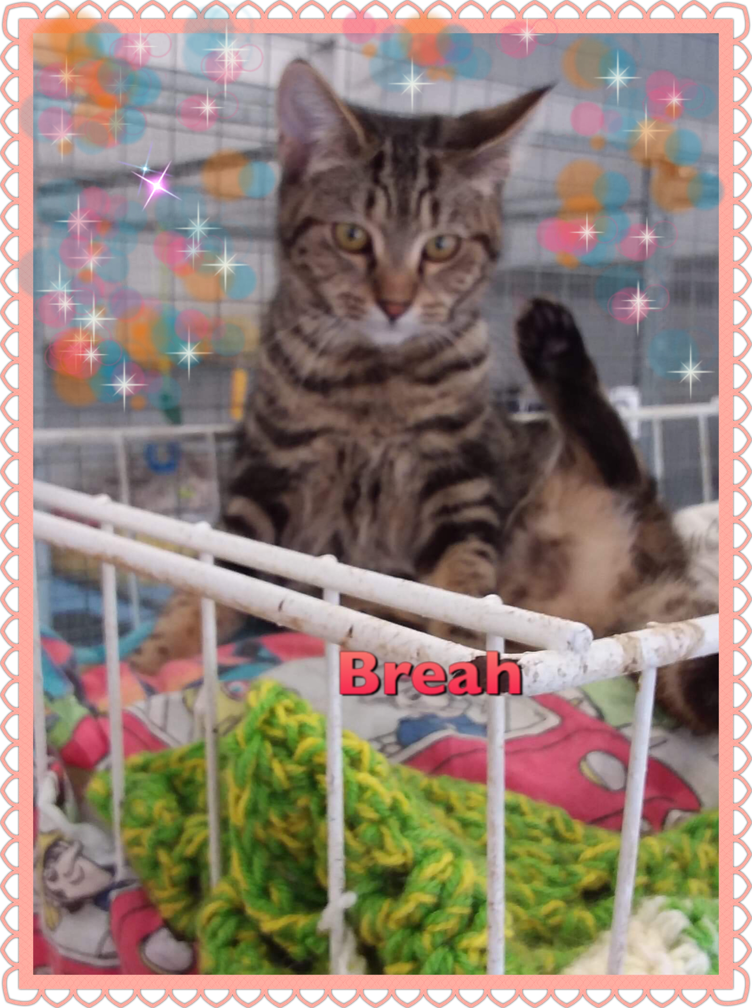 Breah Has beautiful markings on her coat. She is full of mischief and love. She gets on with everyone.