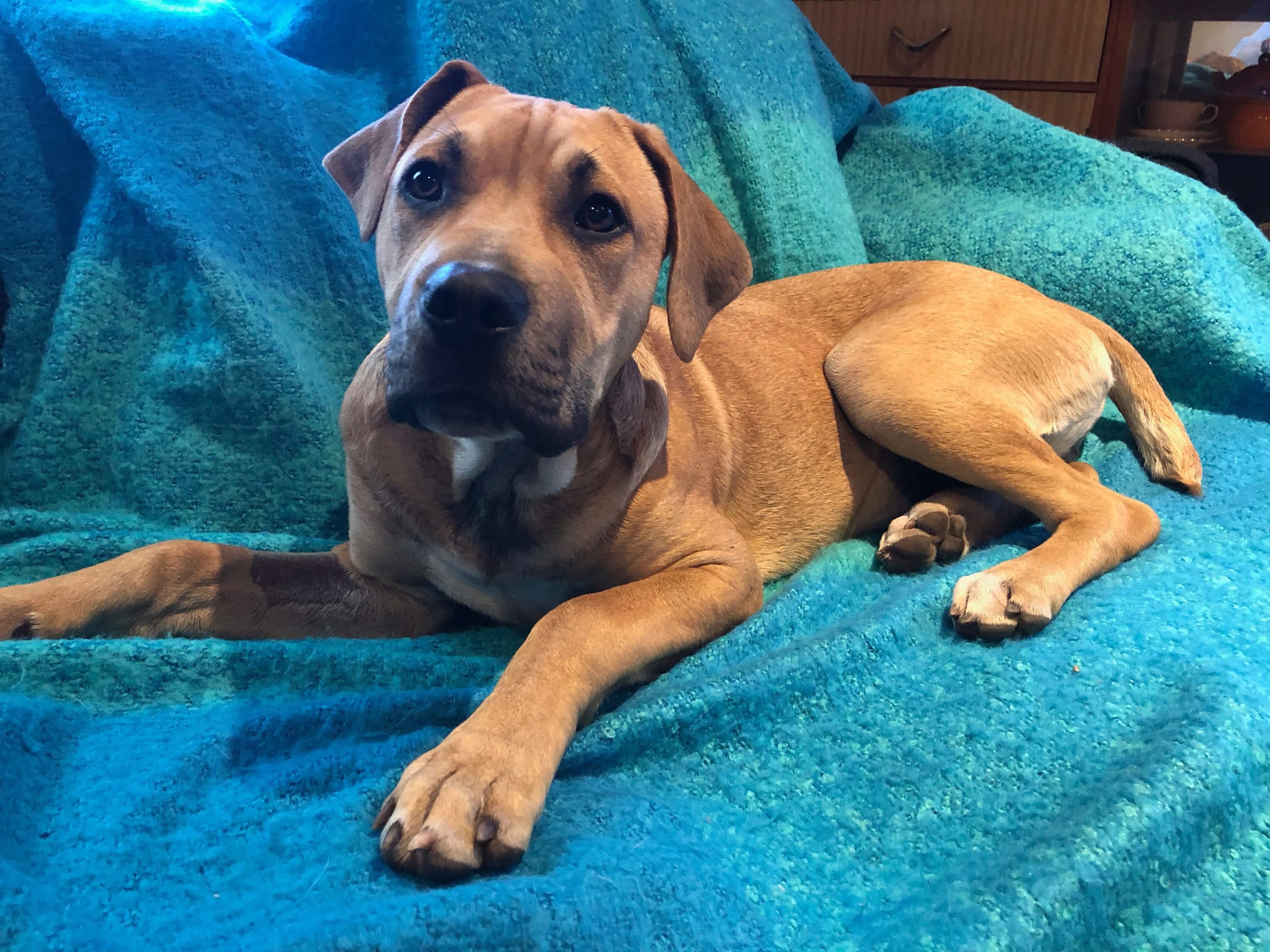At only approximately 5 months, Wilson is a gentle , lovable, goofball. He loves to play tug of war and to chase balls and toys. Wilson is toilet trained and crate trained. He gets on with dogs big and small and is gentle with cats. In the daytime Wilson is quite content in the yard while his foster carer is at work but he is very eager for a play and a snuggle when she gets home. Wilson's favourite place of an evening is sprawled across the lounge with his head in your lap. You will need a big loung though...when he grows up Wilson is going to be quite a large boy. We love this big boy think he is awesome!