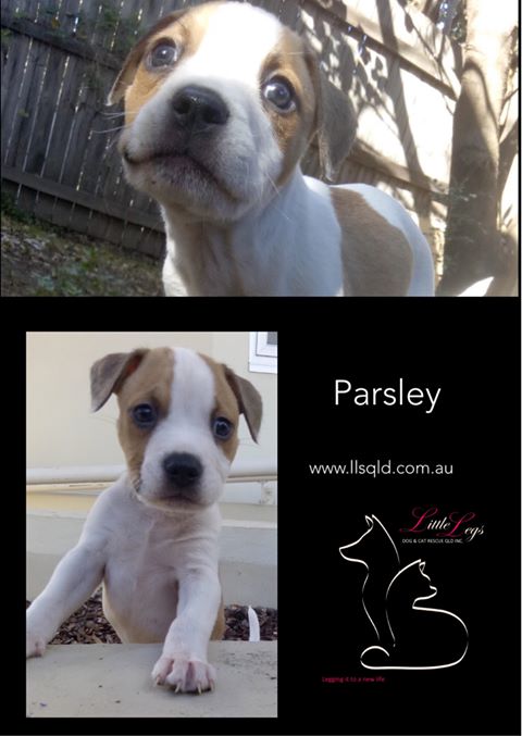 My name is Parsley! I am only 7 weeks old and yet I have the biggest personality of my bunch my foster mummy says. When she picked me up my brothers and sisters were a little scared but I was just running around the place happy as larry. I am cheeky and I have the smile and butt wiggle to prove it. I love to cuddle and if I don't get my cuddles I will put on my sad face and you wont be able to resist. I even have a little love heart shape on my side. I am going to be a big boy so will require training. I cant wait to meet my family and make them laugh all the time!