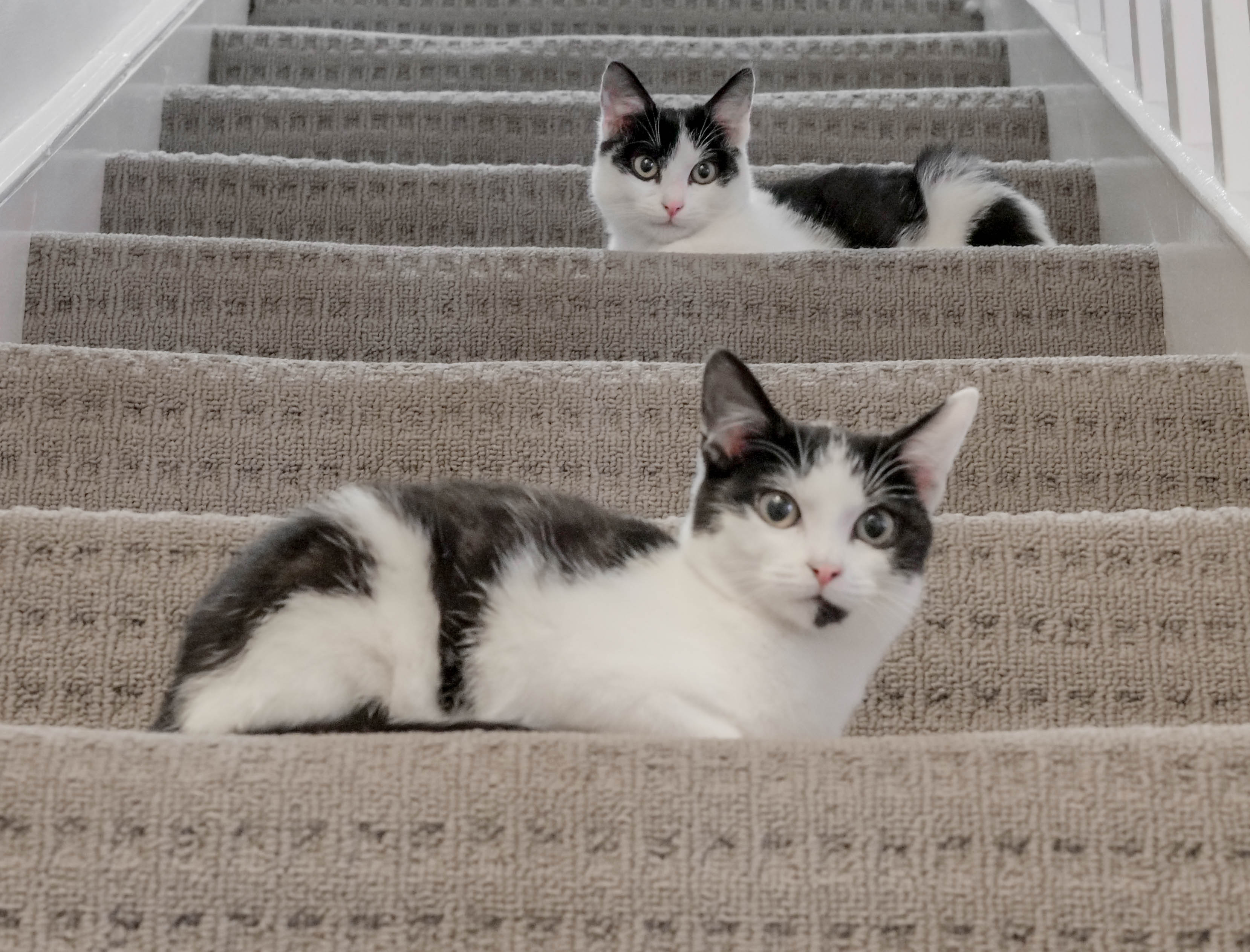 At first we were both so scared and liked to hide behind things in our room. Now we like to roam the house, say hi to uncle Joey (house dog) and mother Bootsy (house cat), she likes to give us a little hiss if we get too close but we love her anyway.