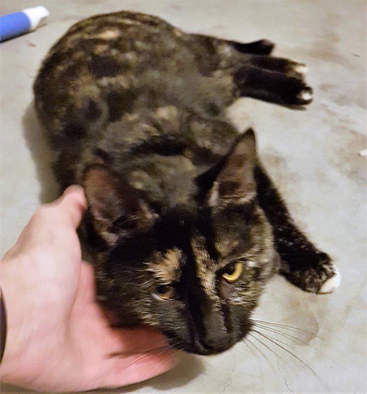 Cinders is a stunning, domestic short-haired, tortoiseshell female cat.